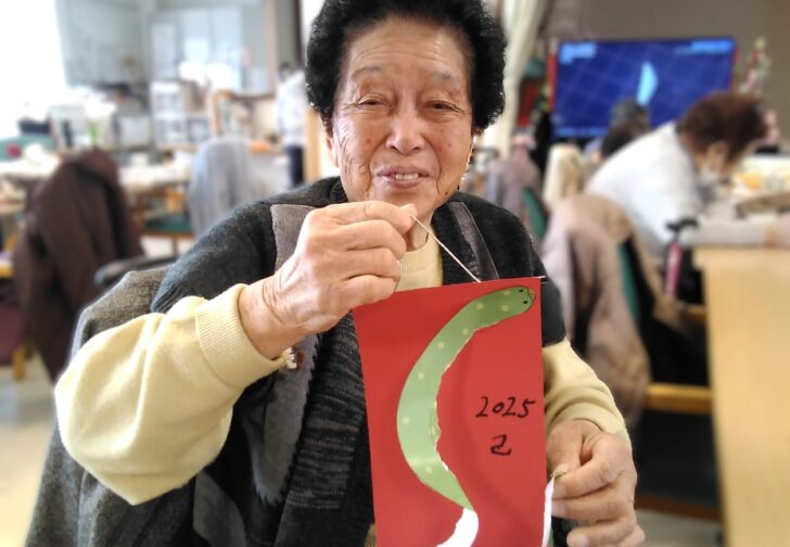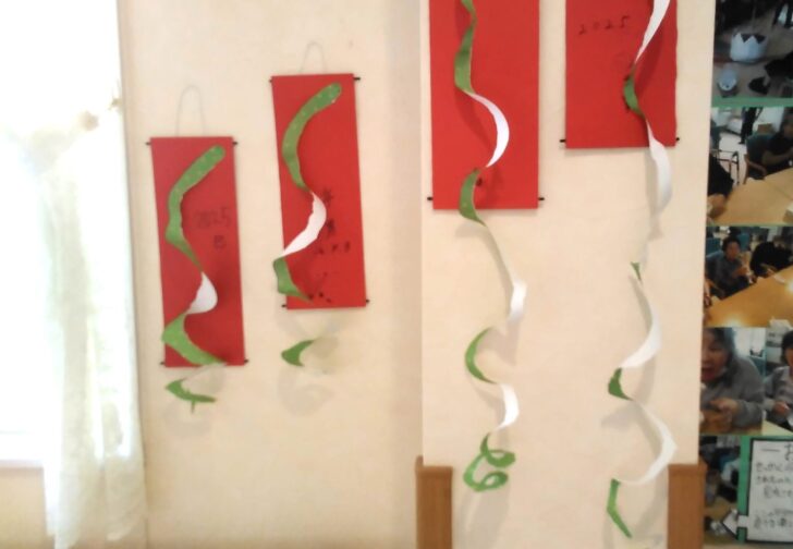 皆さんが協力して作ってくれた今年の干支♪ 可愛い白蛇さんがお出迎えし……
