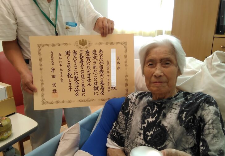 今年百寿を迎える利用者様のご自宅に つくば市長、県知事、内閣総理大臣から……