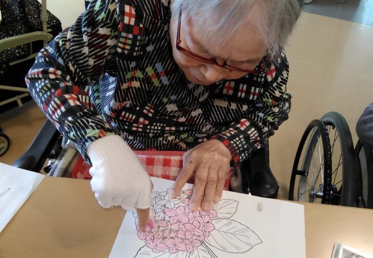 日頃の生活の合間に、手と頭の運動もかねて、塗り絵をしていただいています(^^)……