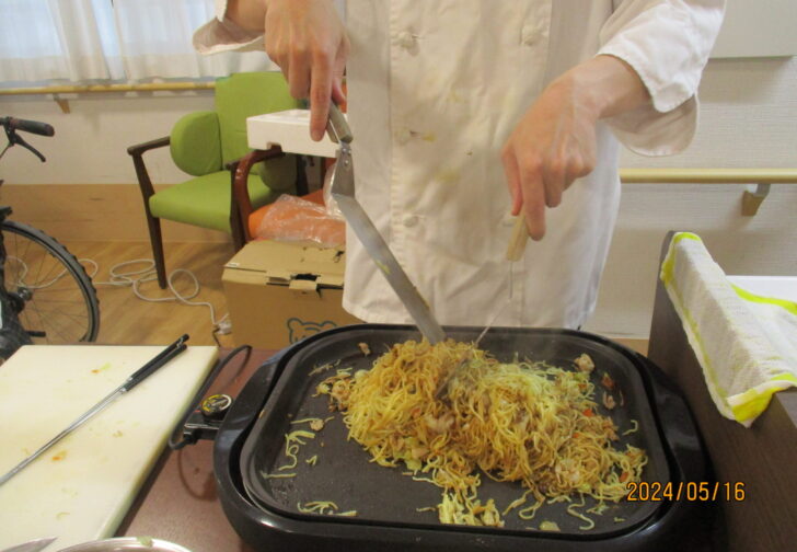 今月の行事食は焼きそばです。以前はカップ焼きそばを食べましたが、今回は管理栄養……