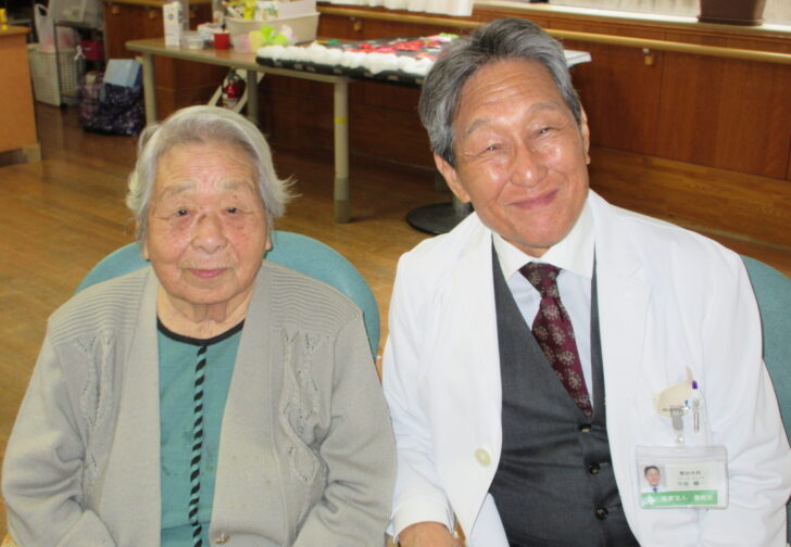 市原会長と笑顔で記念写真をとりました。100歳の利用者様も満面の笑み'……