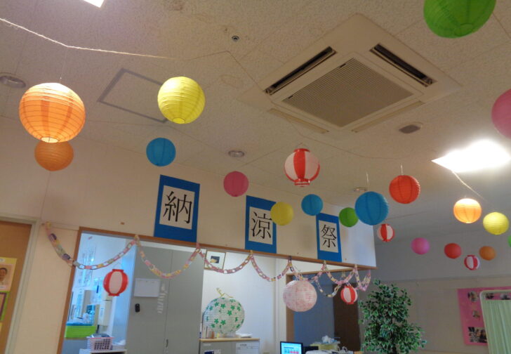 本日は入所ユニットの納涼祭です。各ユニットフロア内、廊下共に提灯が飾られ皆さん……