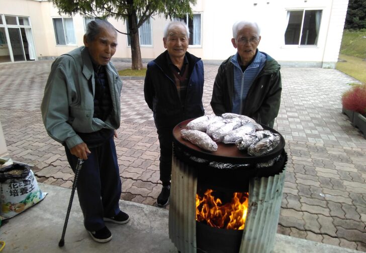 今日は、アネックスの中庭で焼き芋を行いました。朝は、雨が降っていましたが、お昼……