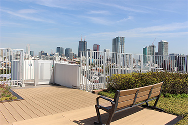 高層ビルと都会の空が爽快です。屋上の緑化に取り組むと共に、ご利用者様がお散歩、ベンチで休憩できる場所になっています。