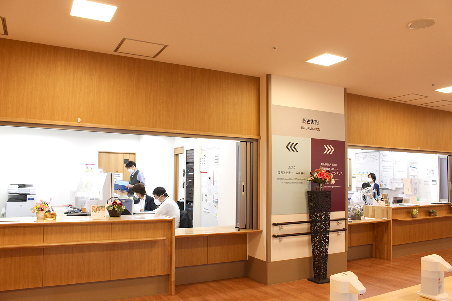 玄関は、特別養護老人ホーム南麻布シニアガーデンアリスとの共用です。ご利用者様とご家族の談話スペース、展示スペースに創作活動の作品や地域の広報誌を展示しています。