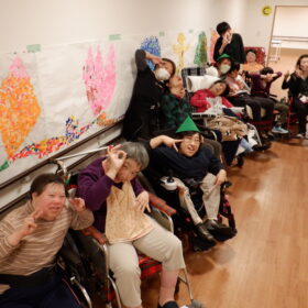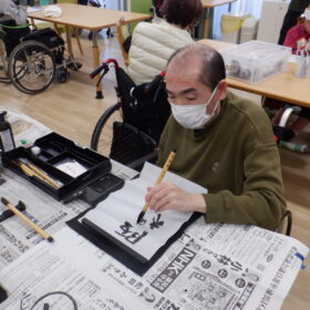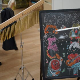 5月より月1回、音楽療法士を招いて、全員参加型の活動を行っています。