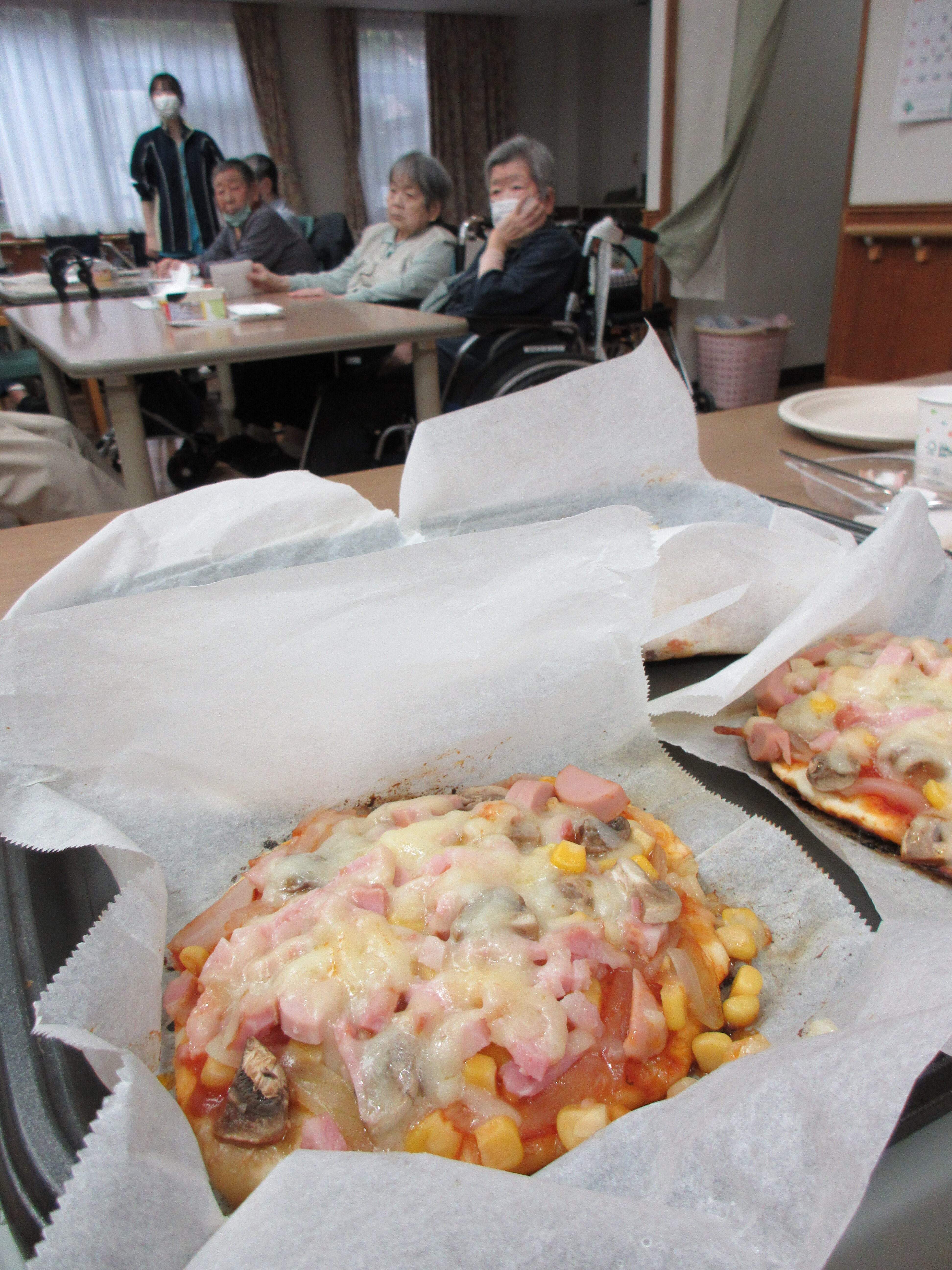 季節の具材を沢山のせてピッザァを焼きました。初めて食べる利用者様も喜ばれていました。「イタリアを感じる~」「孫に自慢できる」と笑顔で召し上がっていました。
