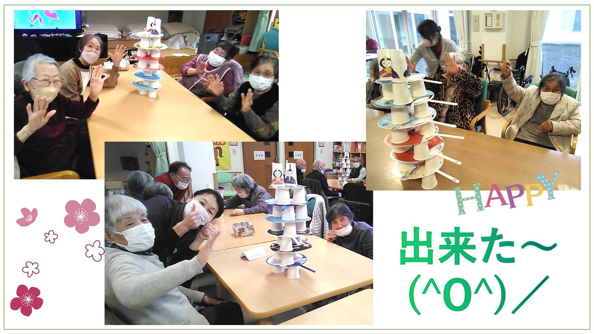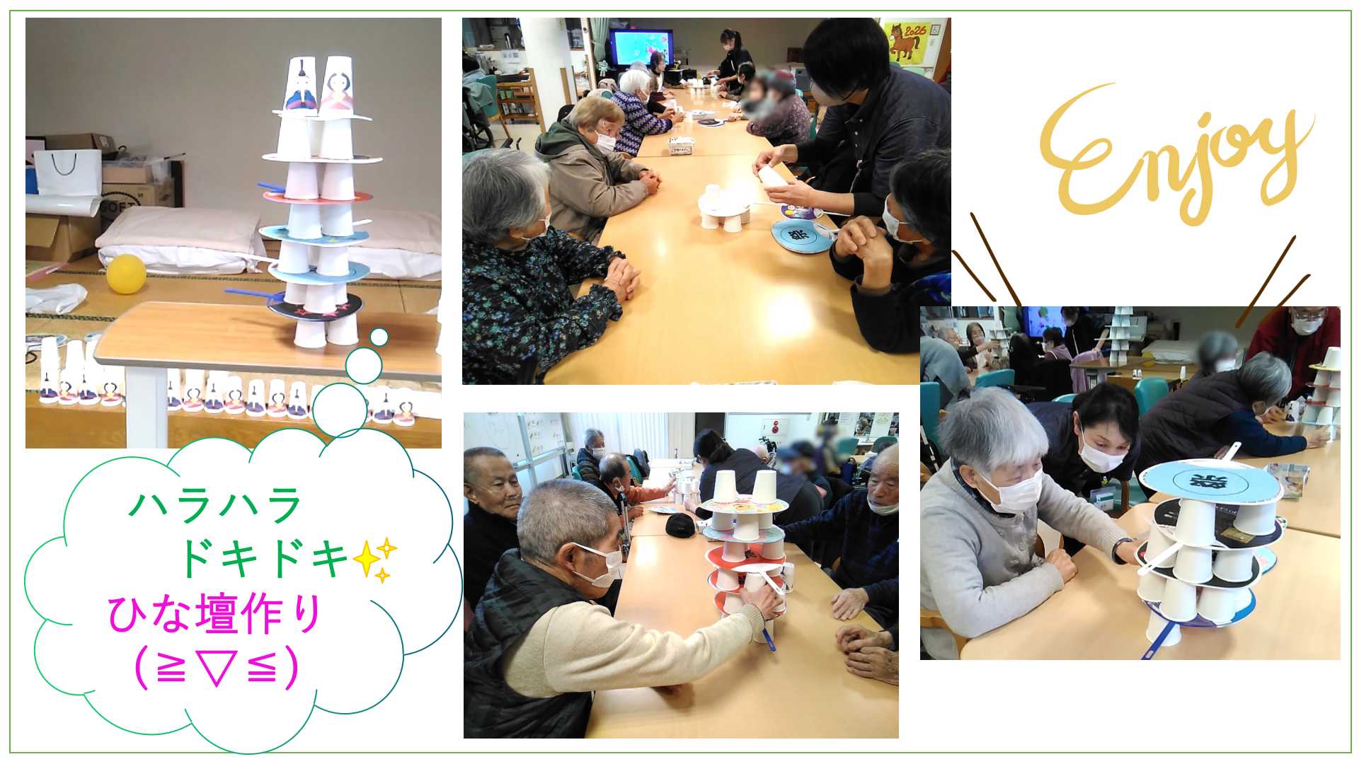 今日のひな祭りイベントでは、まず「ハラハラドキドキ✨ひな壇作り♬」ということで、日ごろのレクレーションの成果を見せていただきましょう(^O^)/