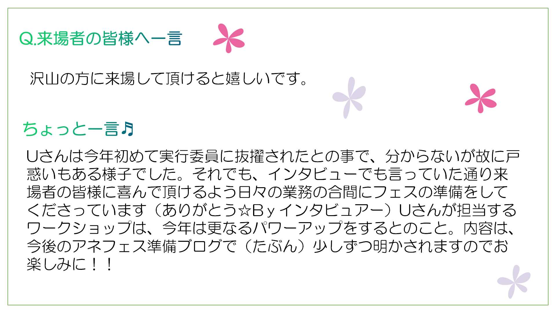 ブログでもお知らせ?ブログ担当間に合うでしょうか(;^ω^)💦(笑)続々とアネフェス情報!がブログ担当に送られてきますが・・・💦