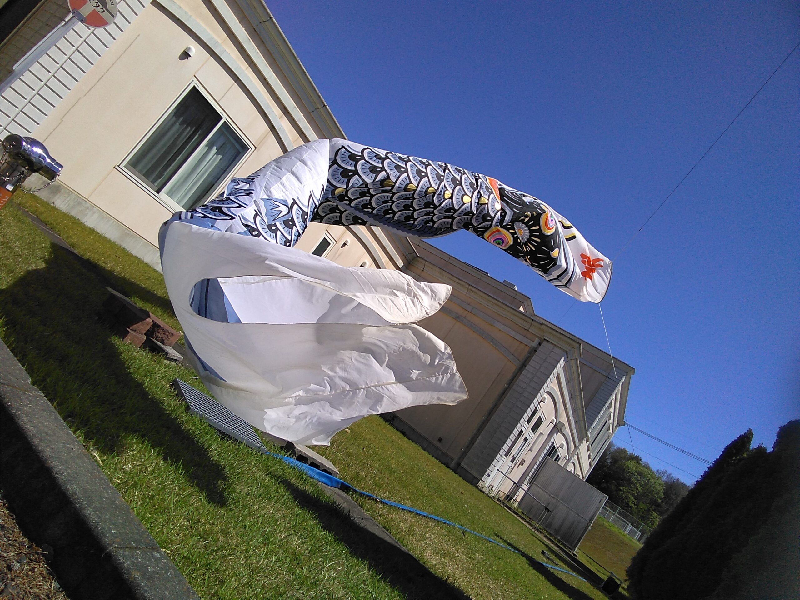 元祖・アネフェス技術班コンビ(昨年の実行委員長・副実行委員長)が再集結し、今年は初めて屋外を泳がせる試み、どうしたら綺麗に泳ぐのか強風の中色々試し…まずは見事真鯉が空を泳ぎ出しました~!(^^)!