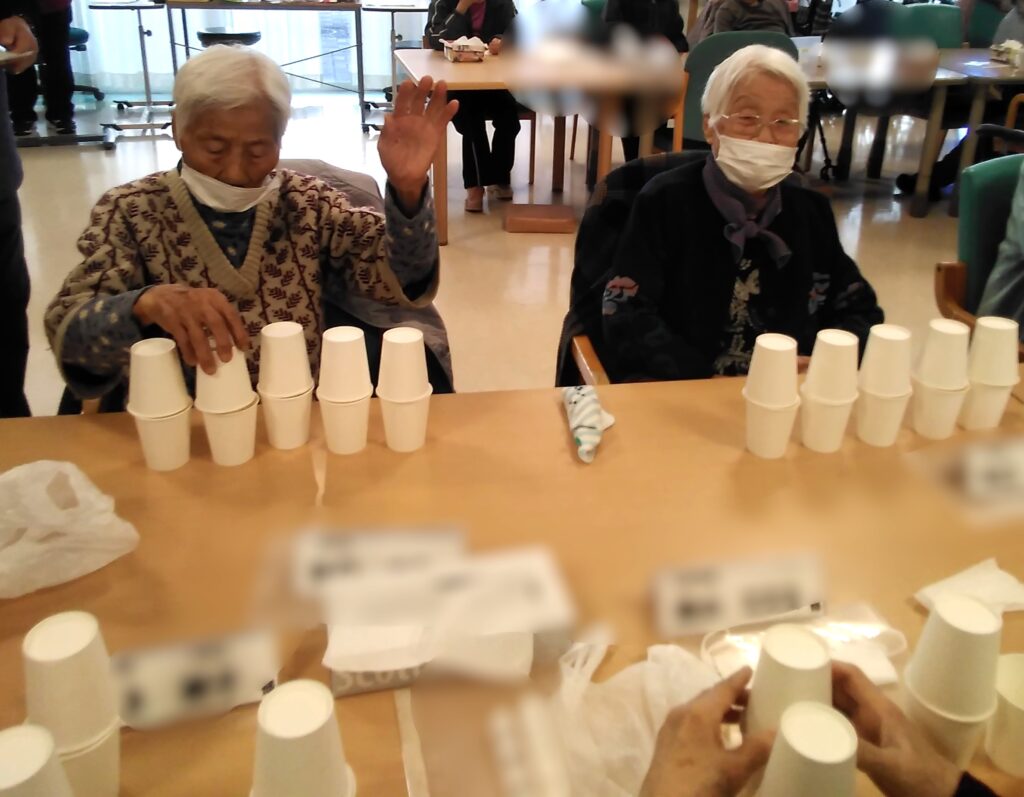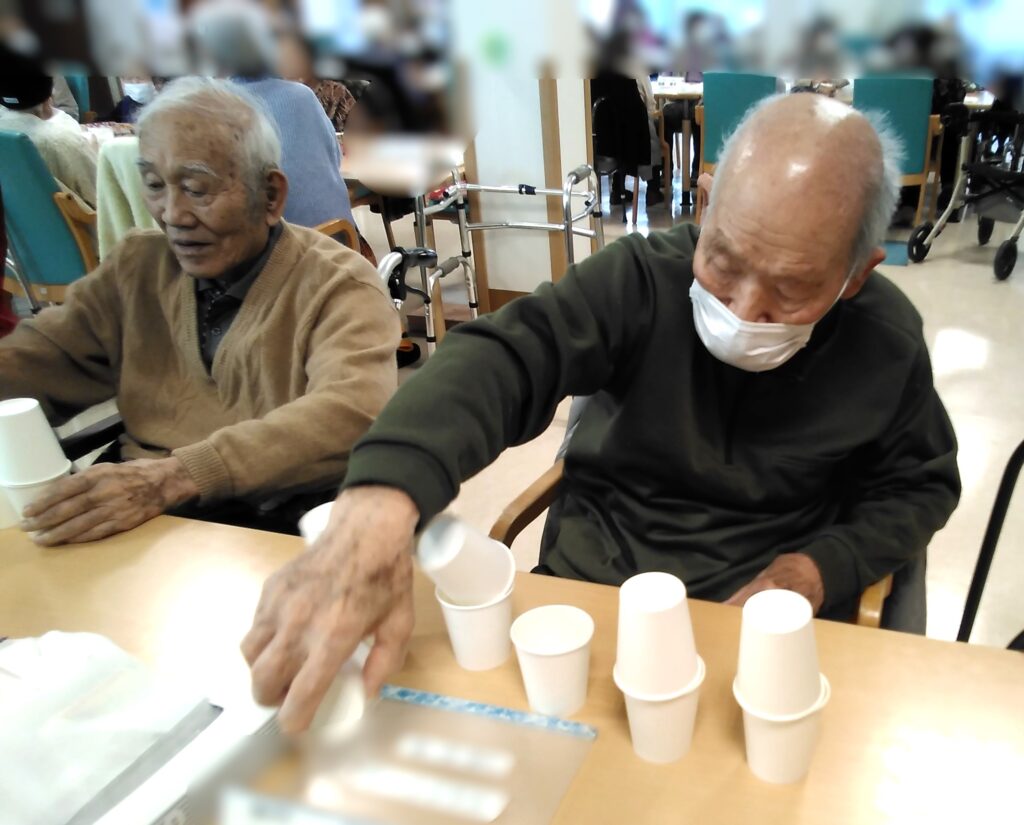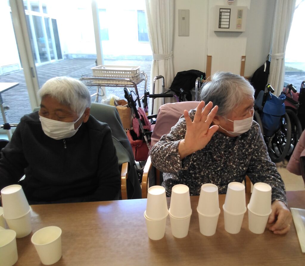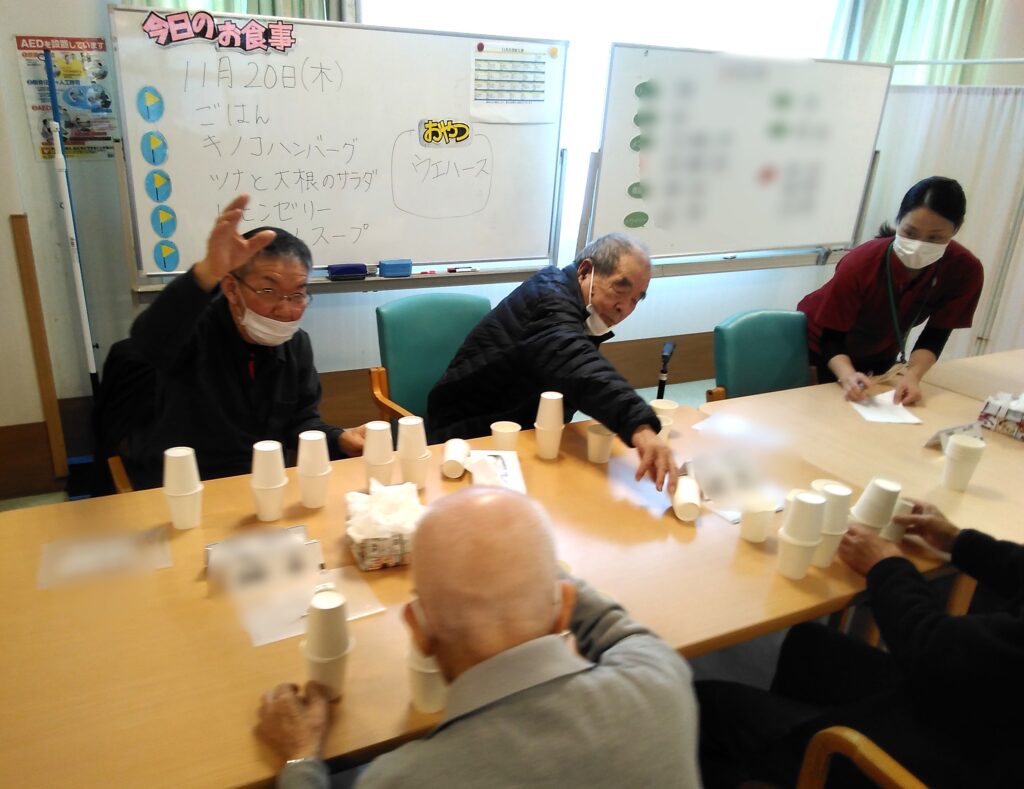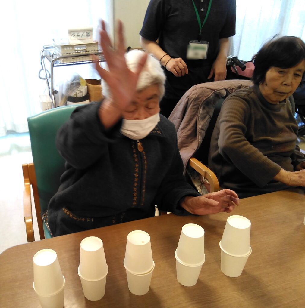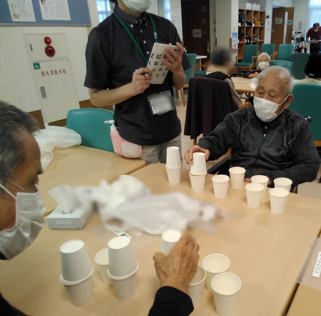 チャレンジゲーム週間ということで、毎日午後のレクリエーション時間はこんな感じで、どのテーブルでも紙コップを広げてチャレンジしてくれてます(^O^)/