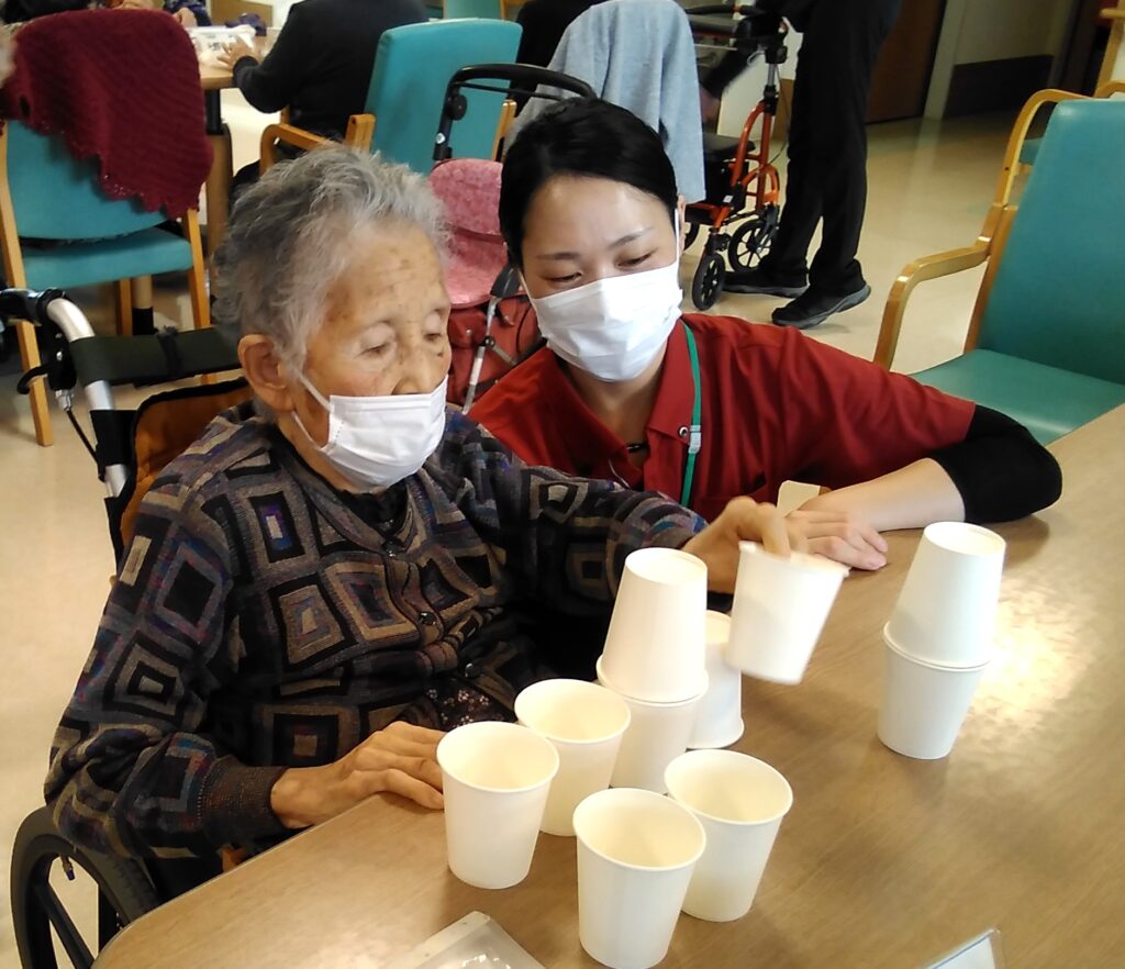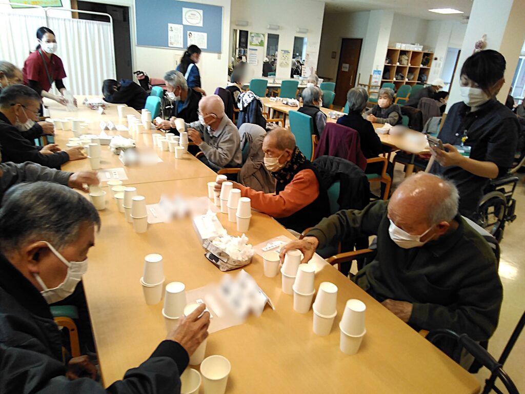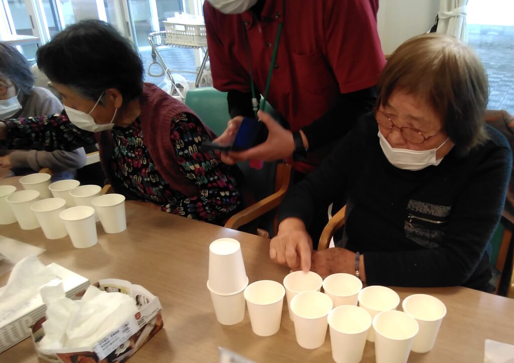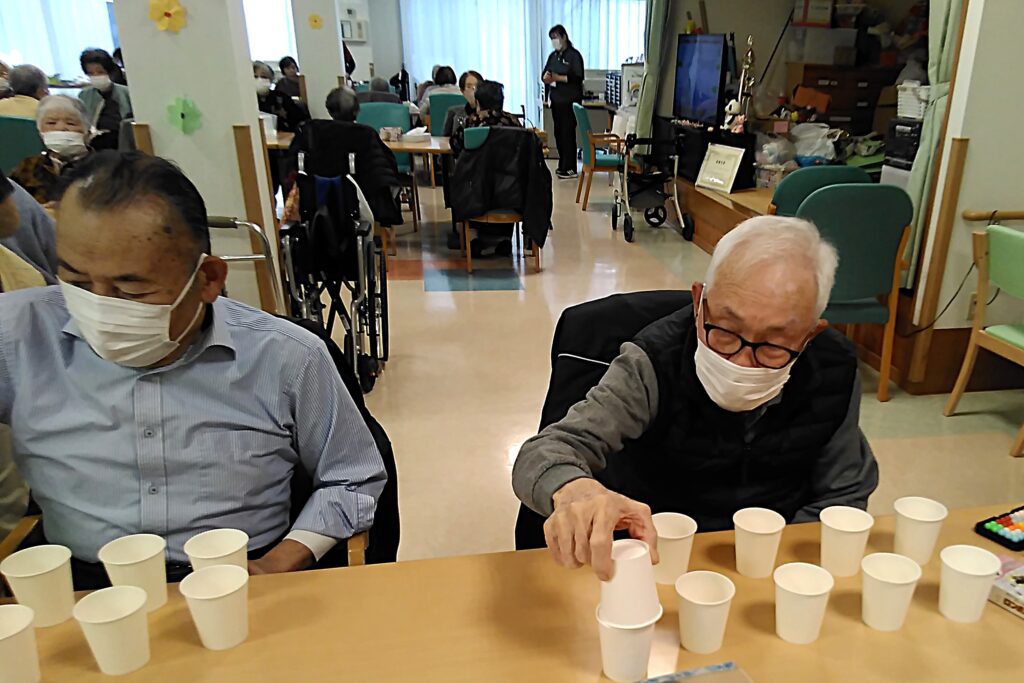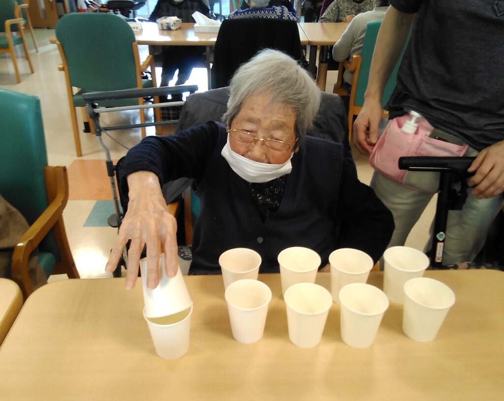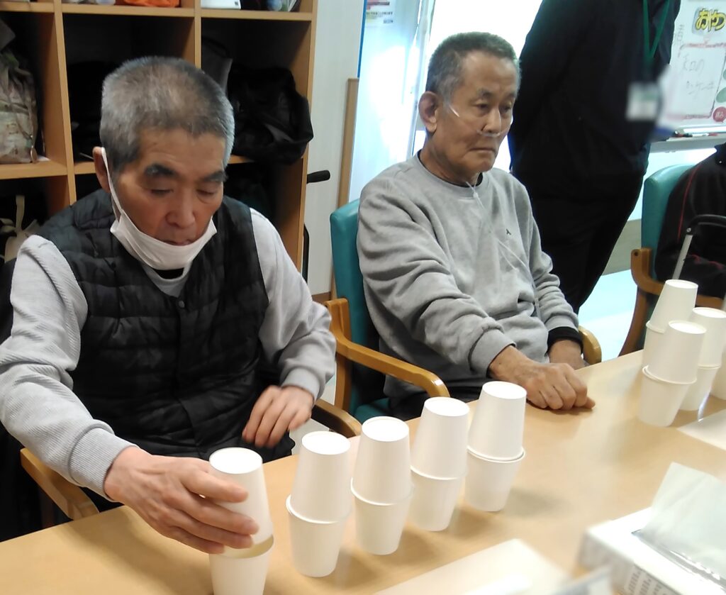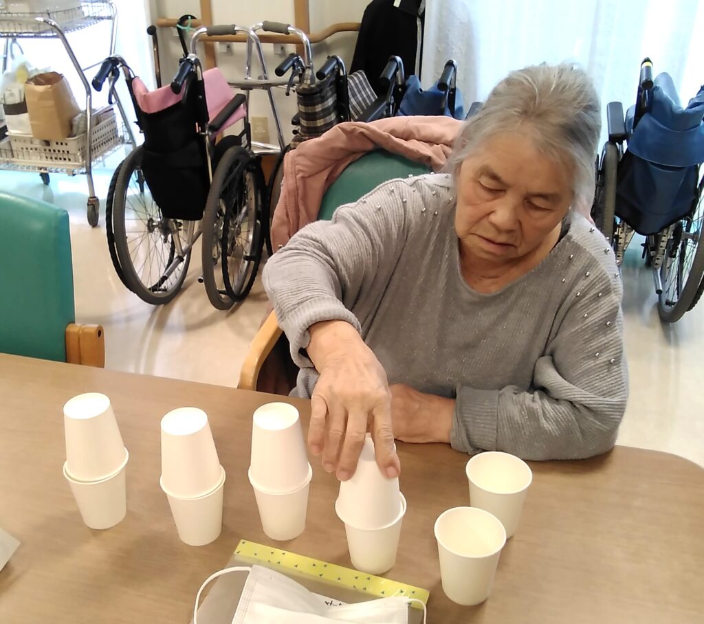 チャレンジゲーム週間ということで、毎日午後のレクリエーション時間はこんな感じで、どのテーブルでも紙コップを広げてチャレンジしてくれてます(^O^)/