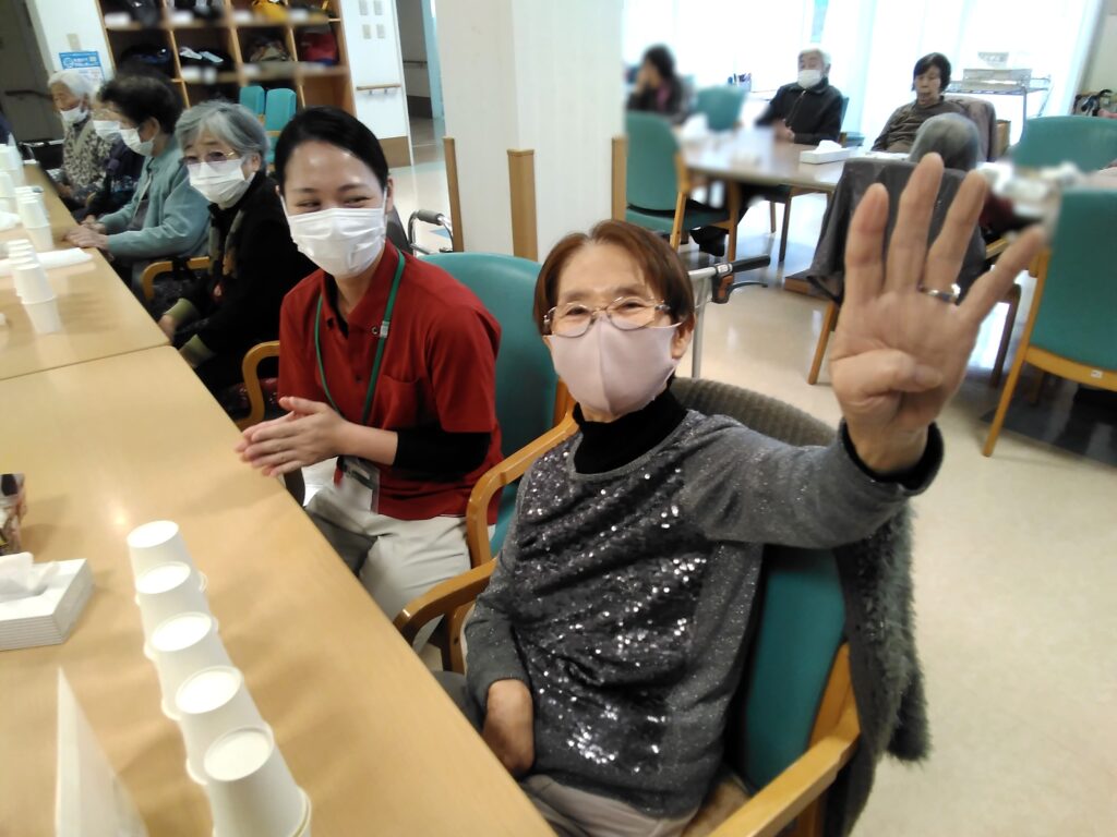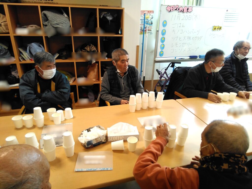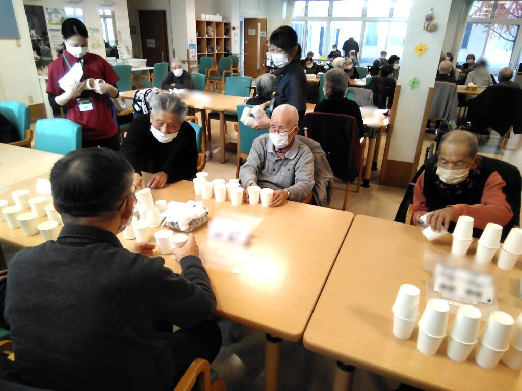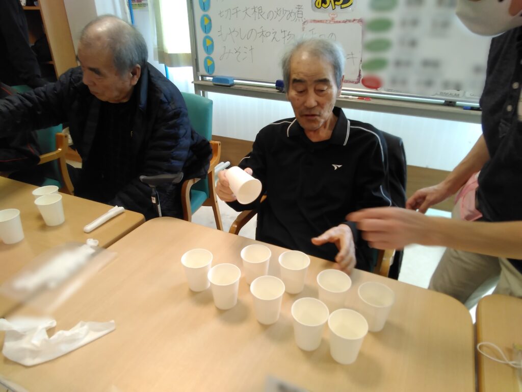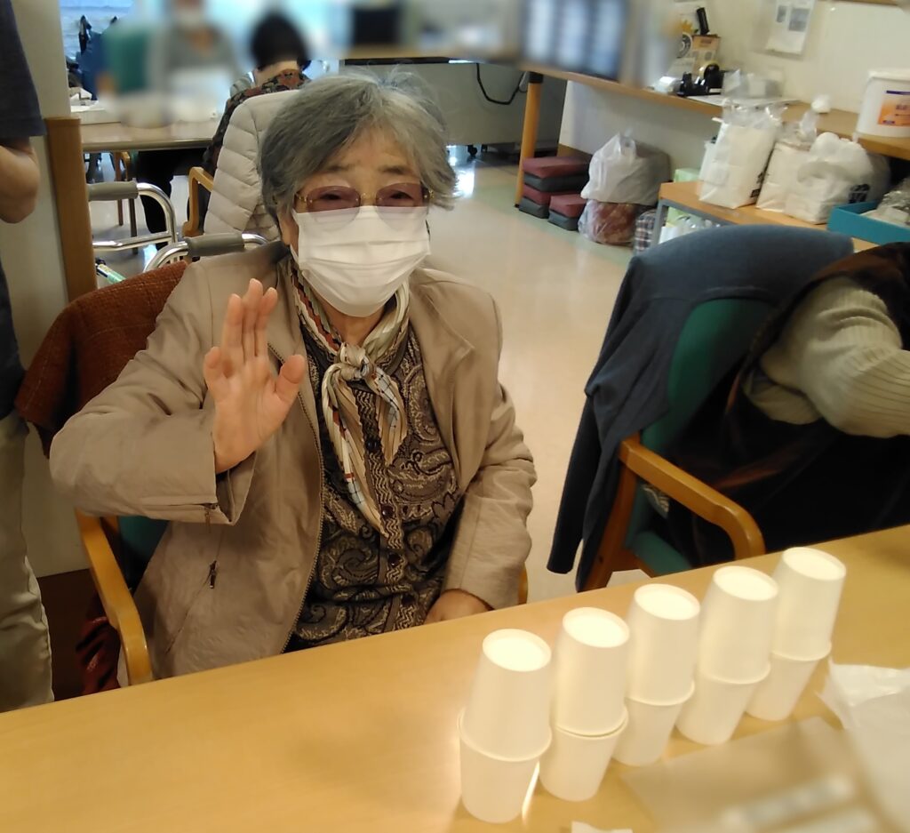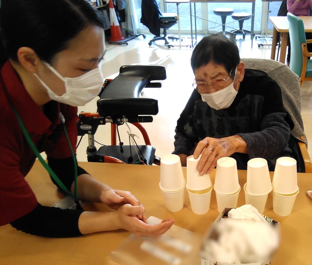 チャレンジゲーム週間ということで、毎日午後のレクリエーション時間はこんな感じで、どのテーブルでも紙コップを広げてチャレンジしてくれてます(^O^)/