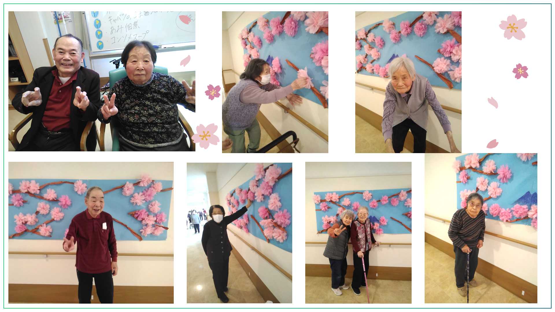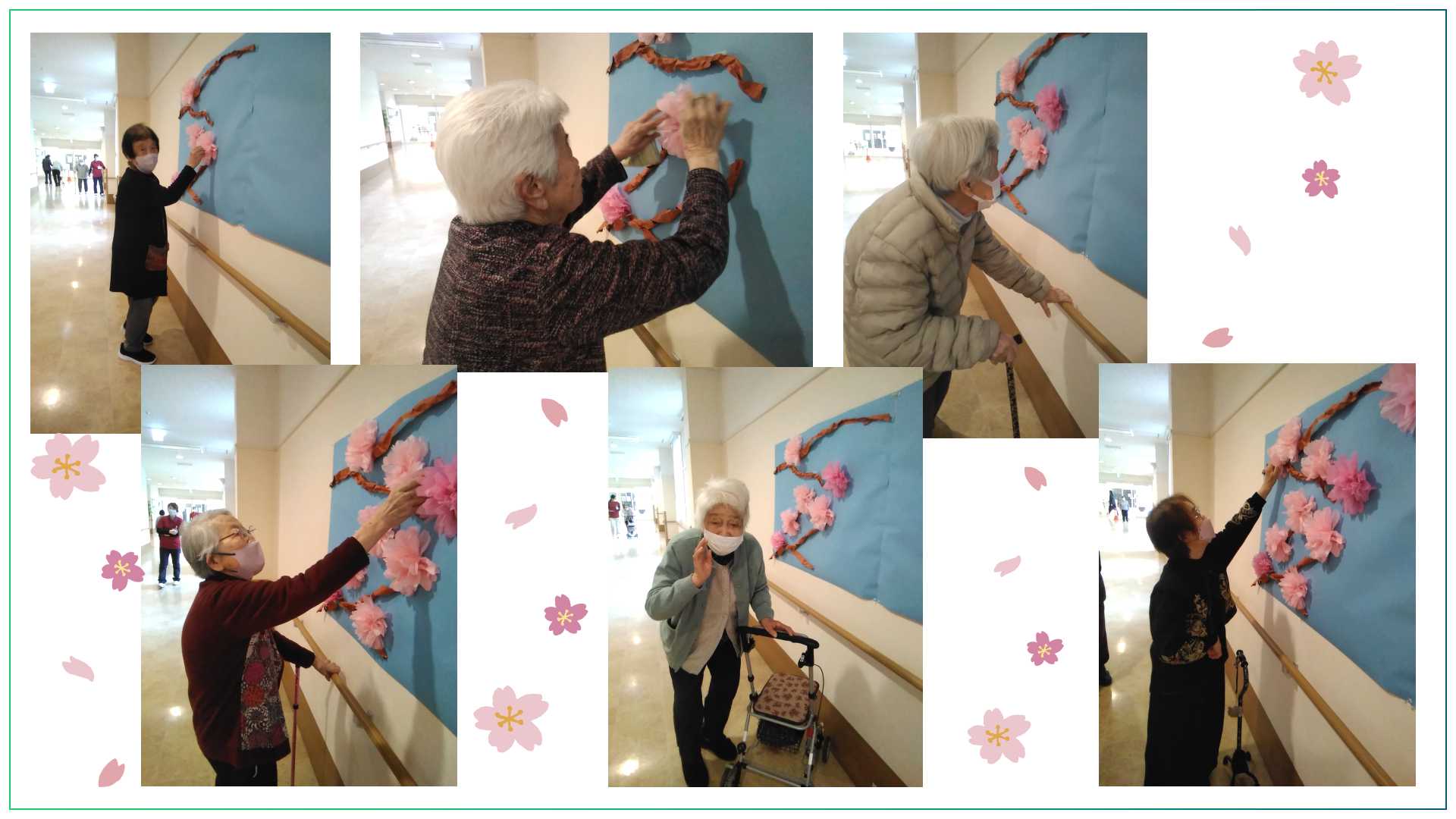 施設の廊下にも桜を咲かせるべく、皆さん歩行練習の合間に桜の飾り付けのお手伝いもしてくださいます!(^^)!