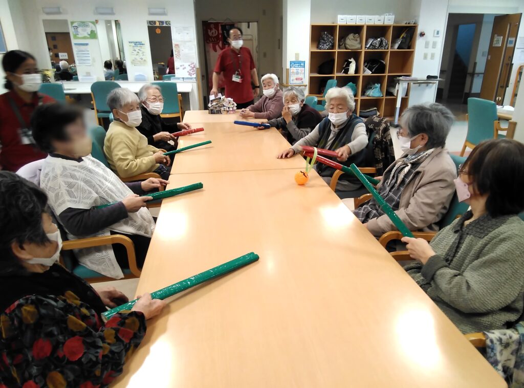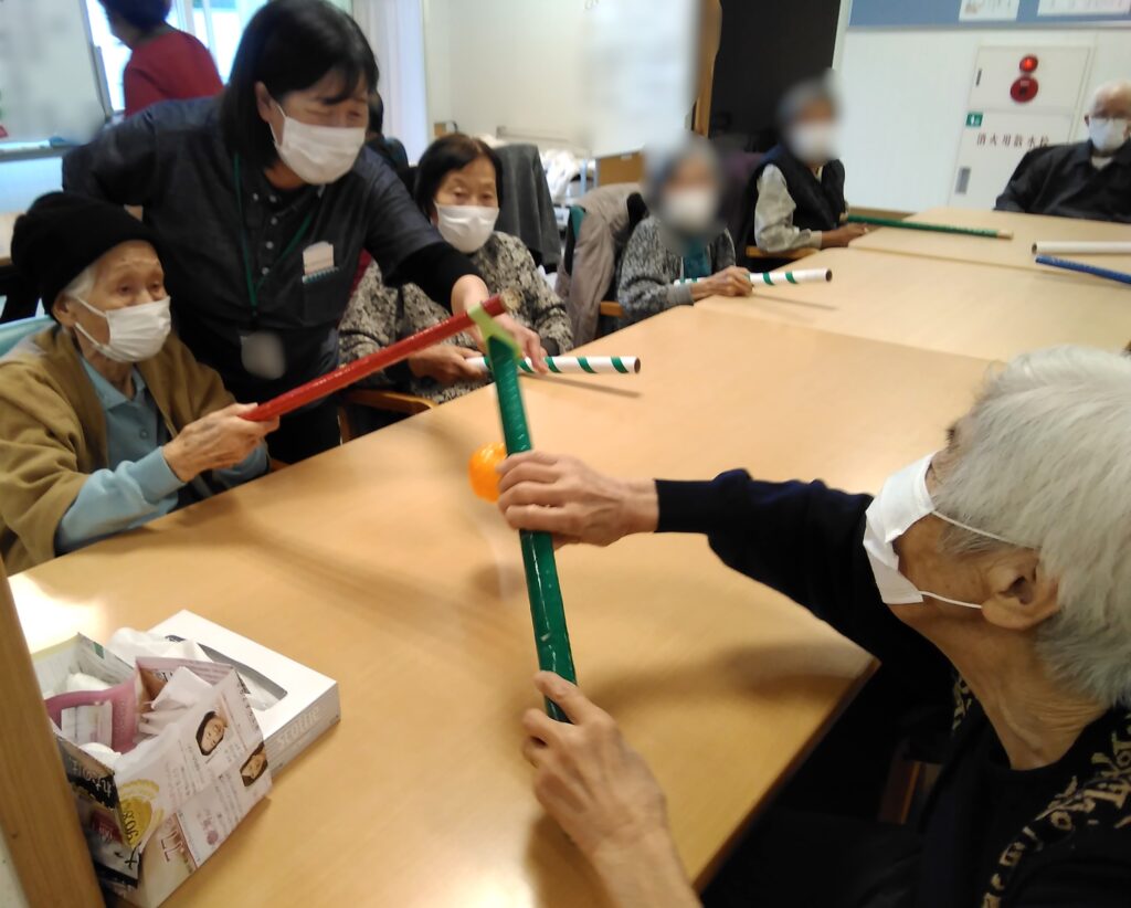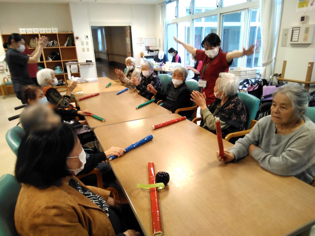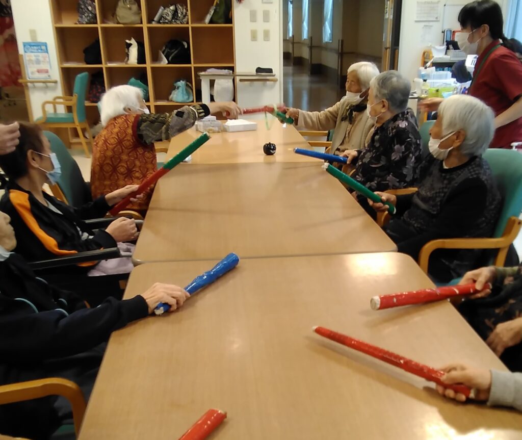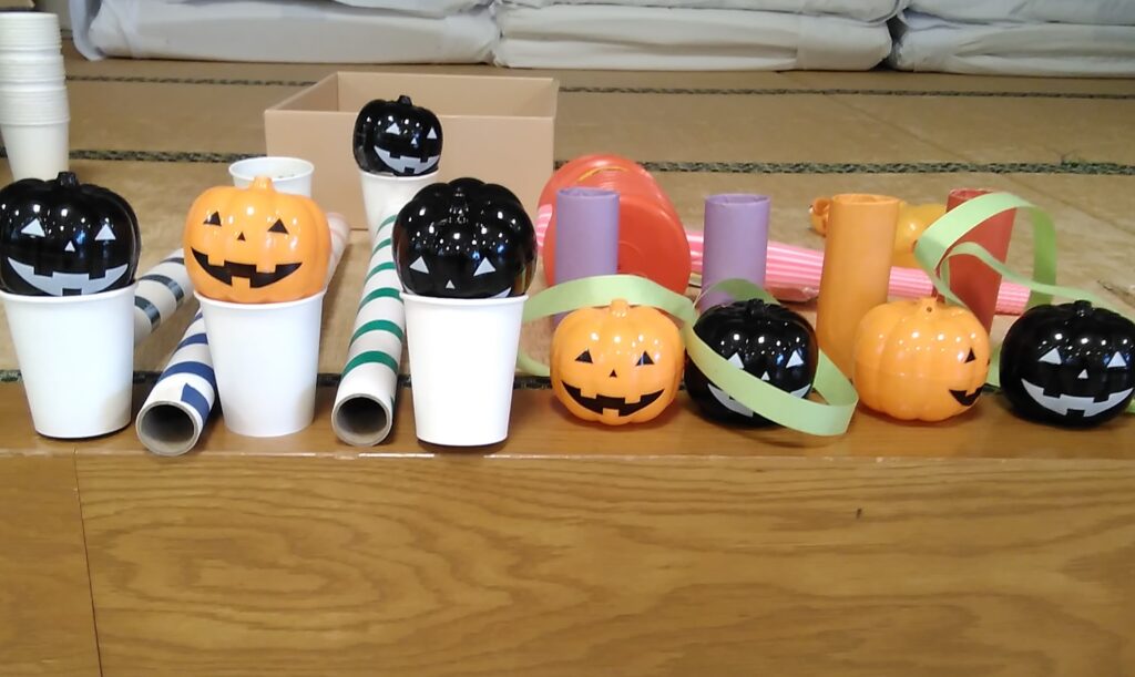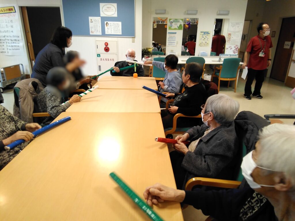初めは皆さんそれぞれに長い棒を持ってカボチャリレーです(^O^)/棒が長いので隣の方に回すのも一苦労(;^ω^)💦