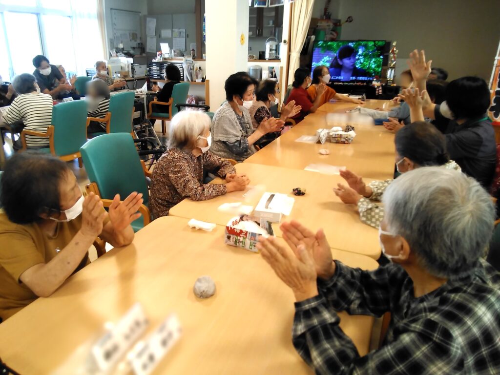 さあ♪音楽に合わせて手拍子👏👏👏 職員だけがノリノリ(;^ω^) 皆さんの目👀はお手玉のようです💦