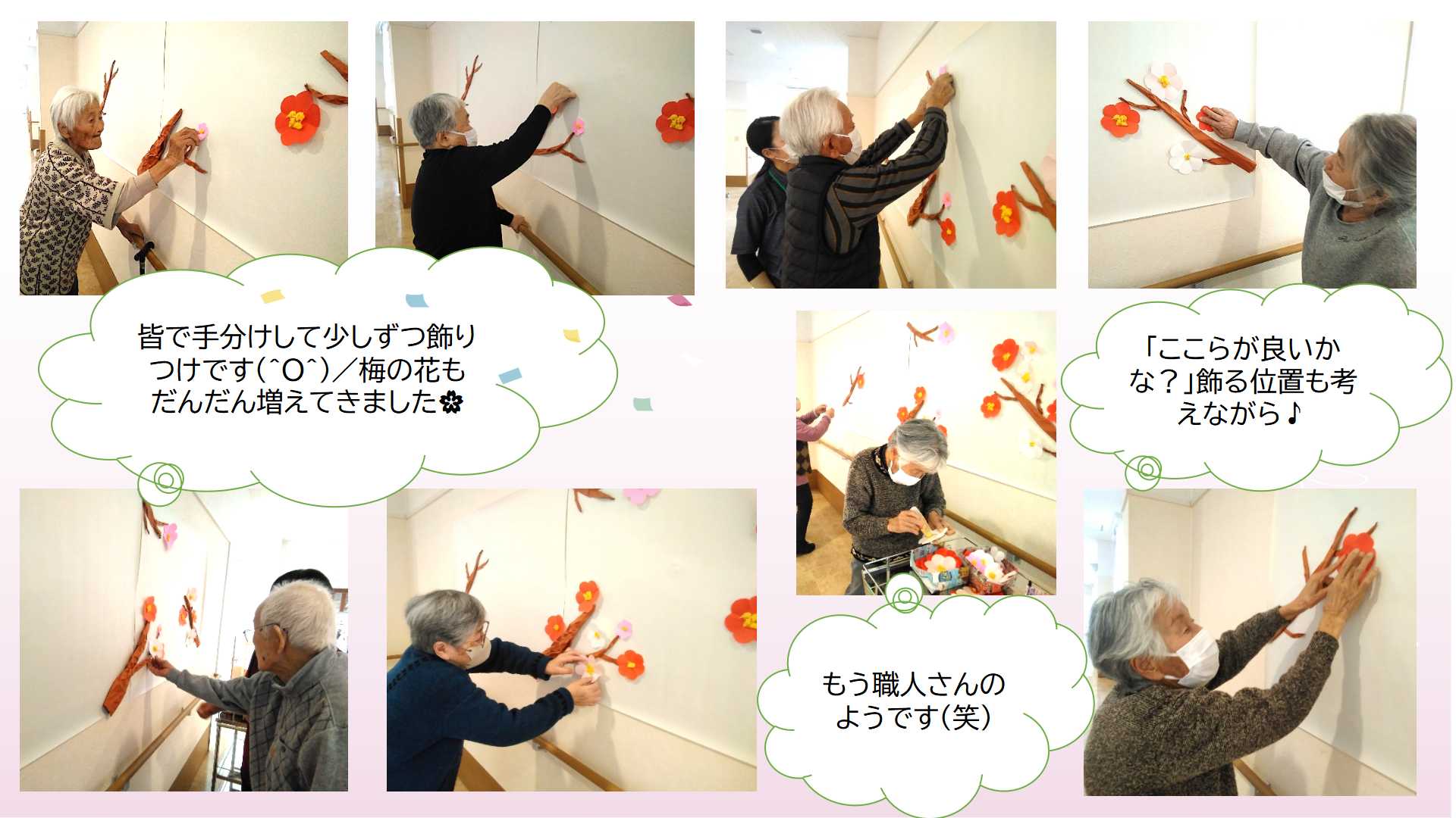 男性の方々もノリノリで梅のお花を飾ってくれてます♬高いところを率先して引き受けてくださるジェントルマン👨の方々(笑)飾り付け後には【我ながら良くできた(^^)v】といったような満足の表情です(笑)