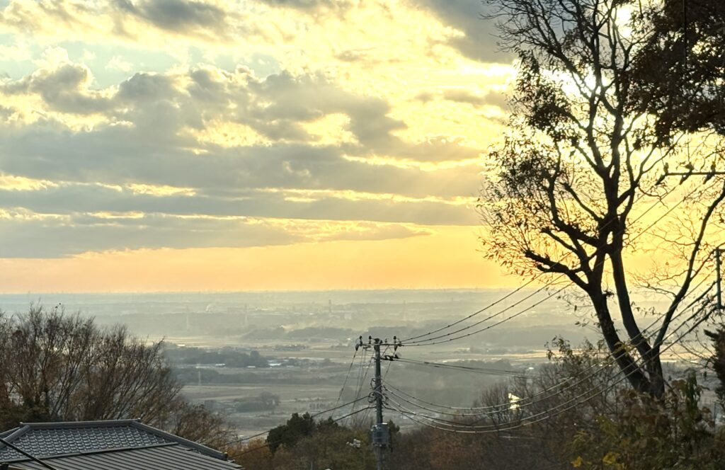 帰りの送迎では、筑波山帰りの他県ナンバーの車とたくさんすれ違いながら、無事に送り届けた後に見える、夕日に照らされた関東平野✨
