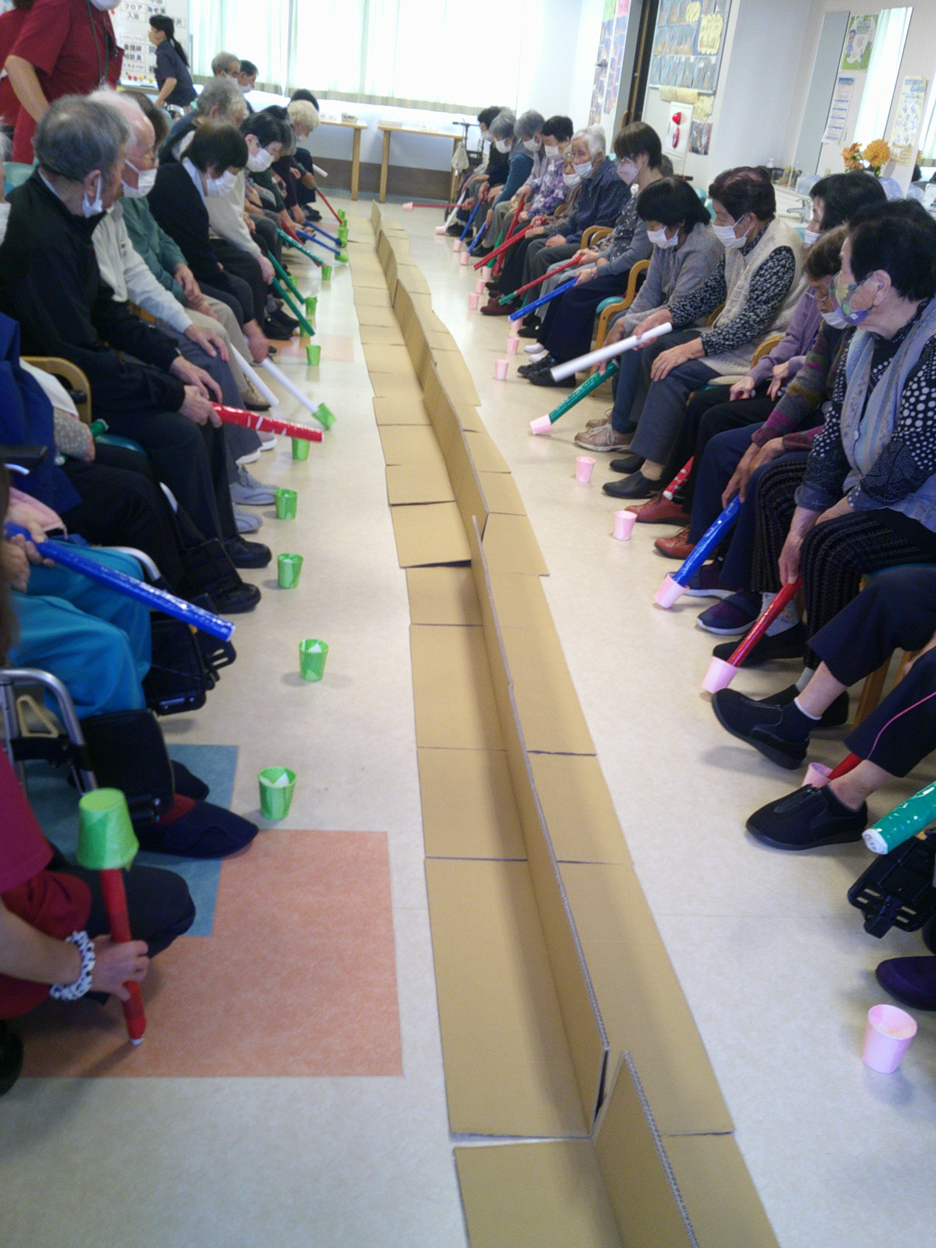 今日は、「運動する会?!」でした。まあ、運動会ですね♬今日は、特別参加の方も多く、朝からとても賑やかでした♪午後からの運動会では何をするんだろうか・・・どんな事させられるんだろうか・・・心配される方もおりましたが、楽しみにしてくれている方の方が多く、話題は午後の運動会の話で盛り上がっていました。