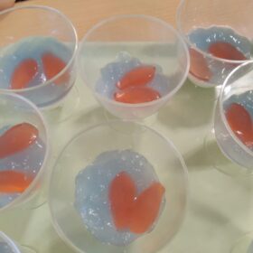 その後は、職員がピンク・黄色と2チームに分かれ、リレーや障害物競争を行い、利用者様にどちらのチームが良かったか評価してもらいました。写真は、各チームの代表がお腹に風船を挟んで落とさないようひょっとこの待つゴールを目指している所と、障害物競争で定番の粉から飴探しに身体を?顔を?はって挑んでくれた代表選手のお顔です(^_^)/