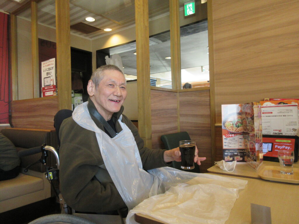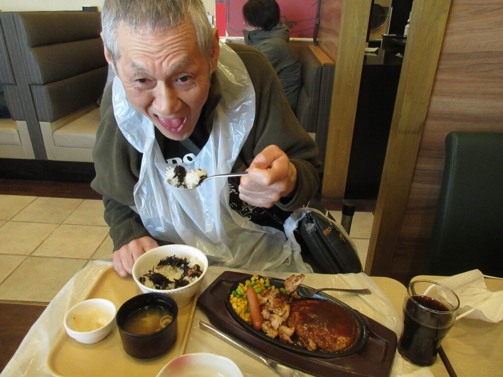 利用者様から「肉が食べたい。」との要望があり、美術展会場近くのファミレスでミックスグリルを注文し、美味しく召し上がられました。