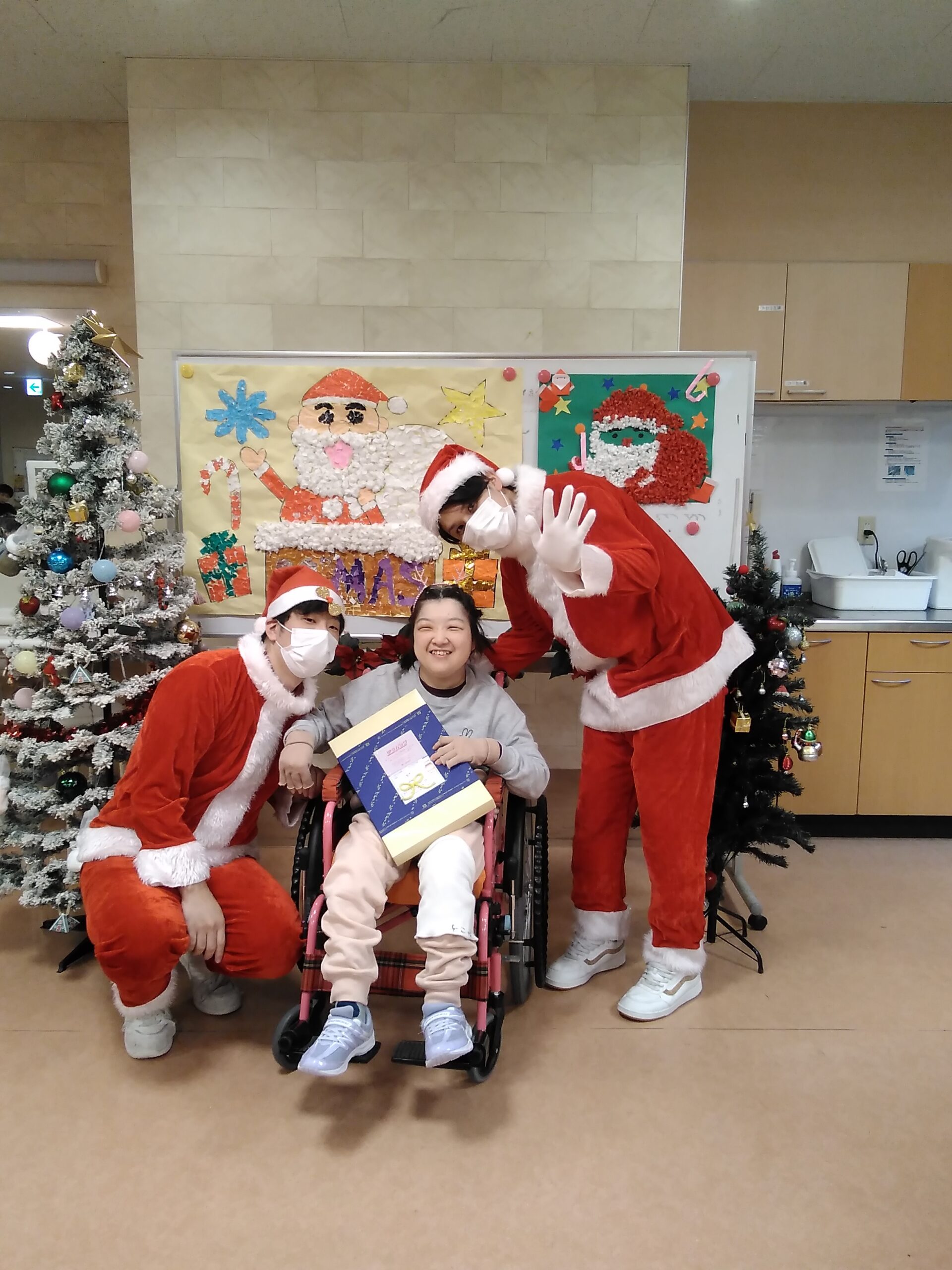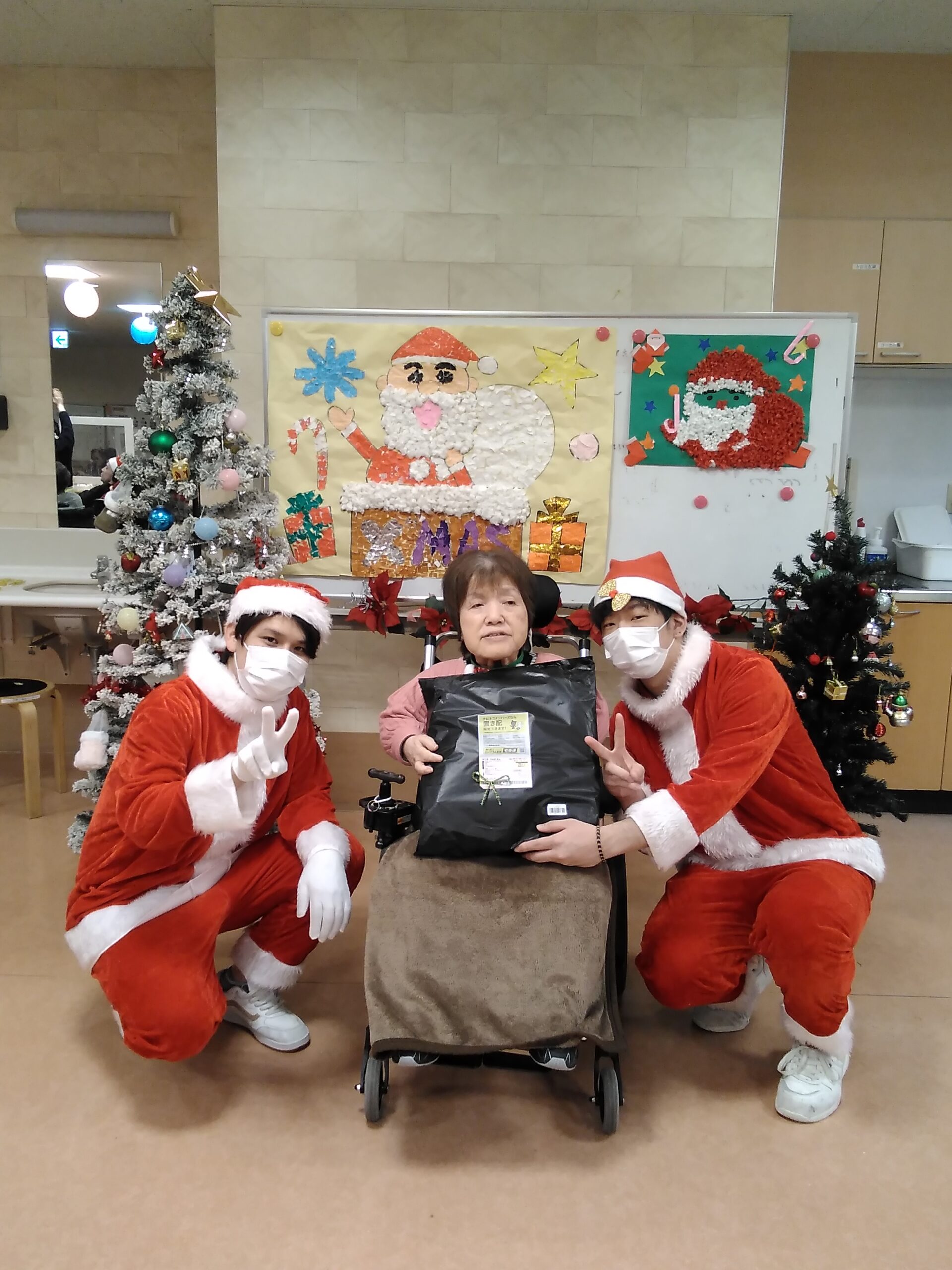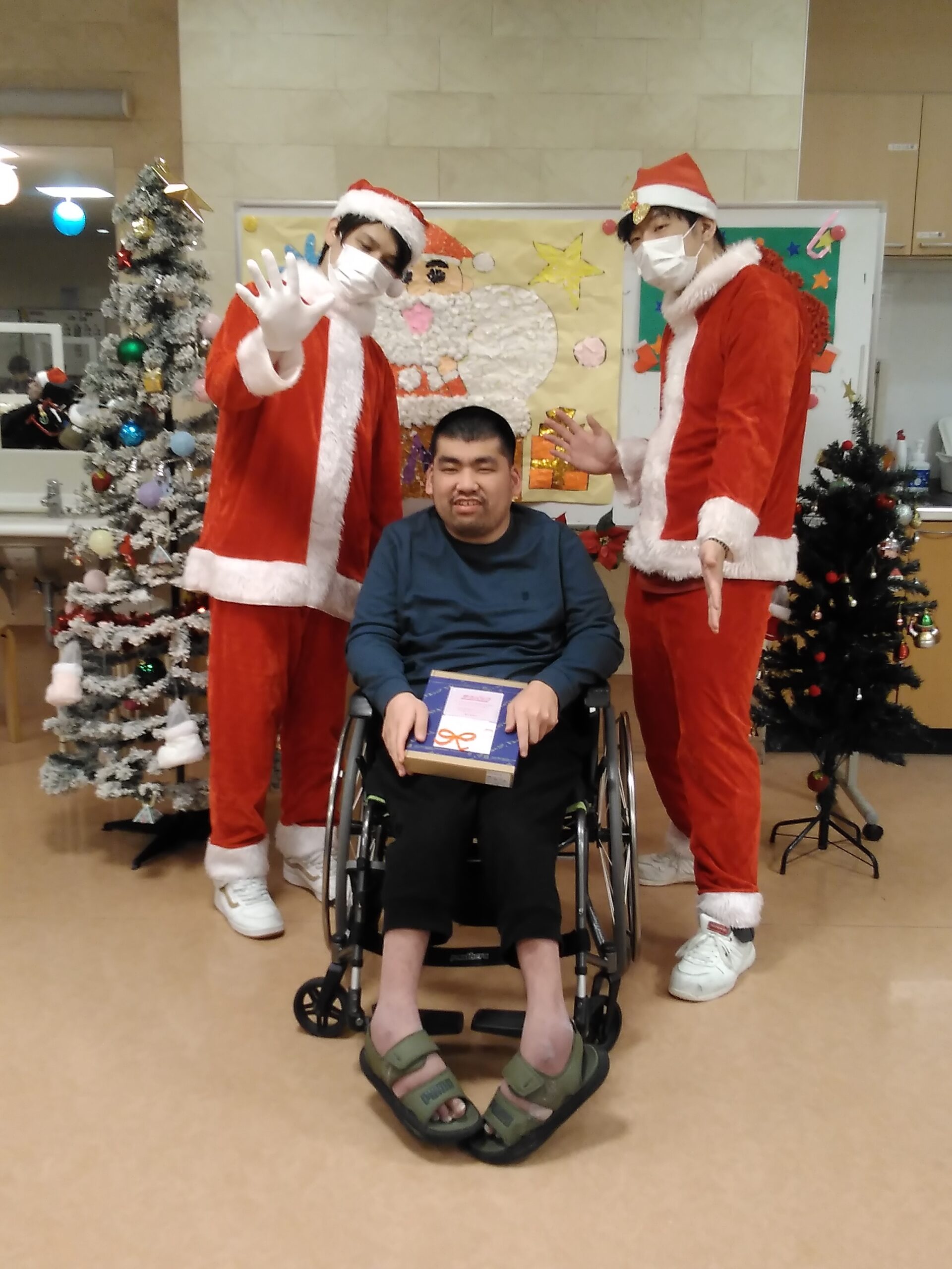 複数人のサンタさんから手渡しでプレゼントを受け取り、写真撮影を行いました。