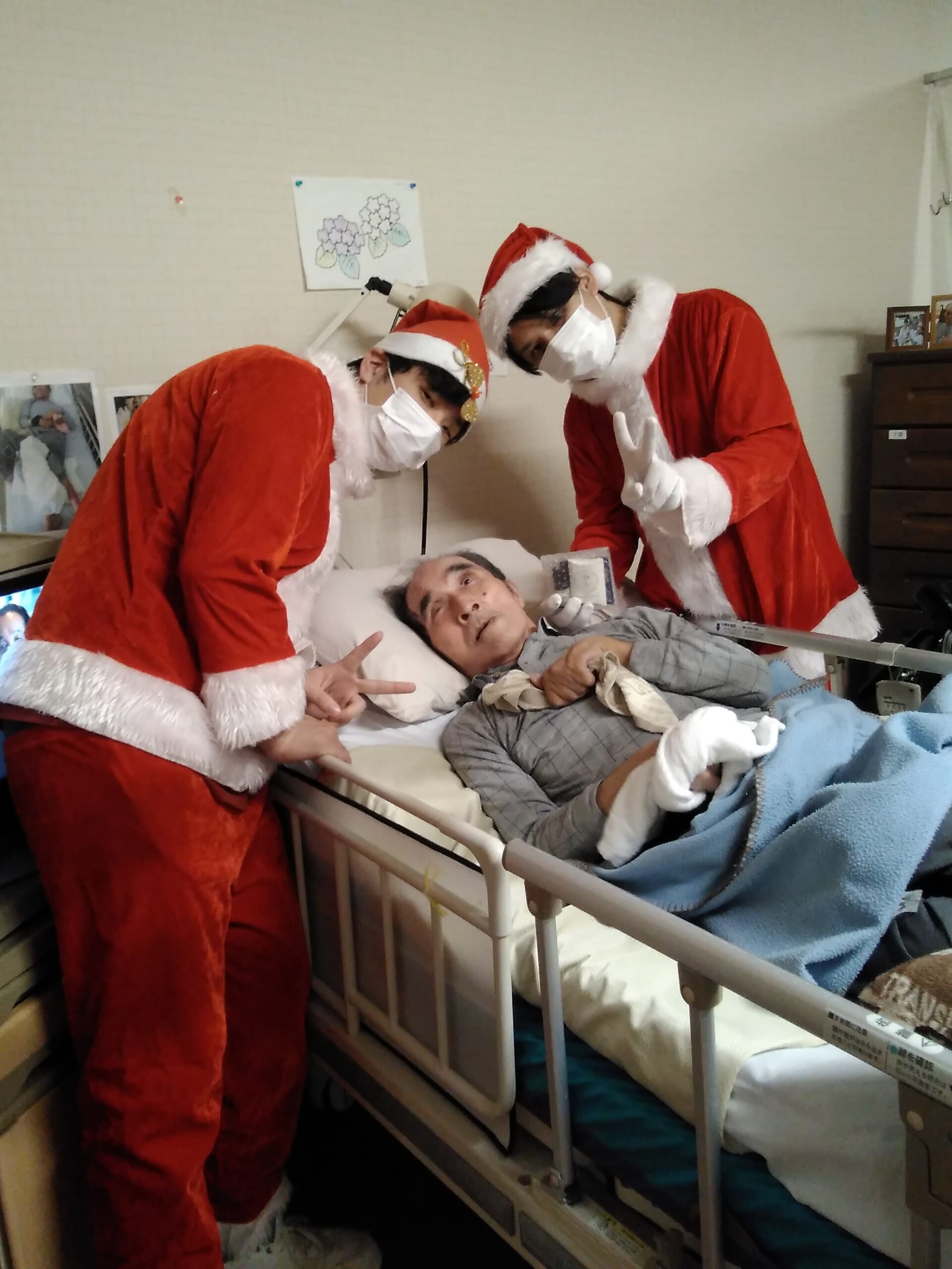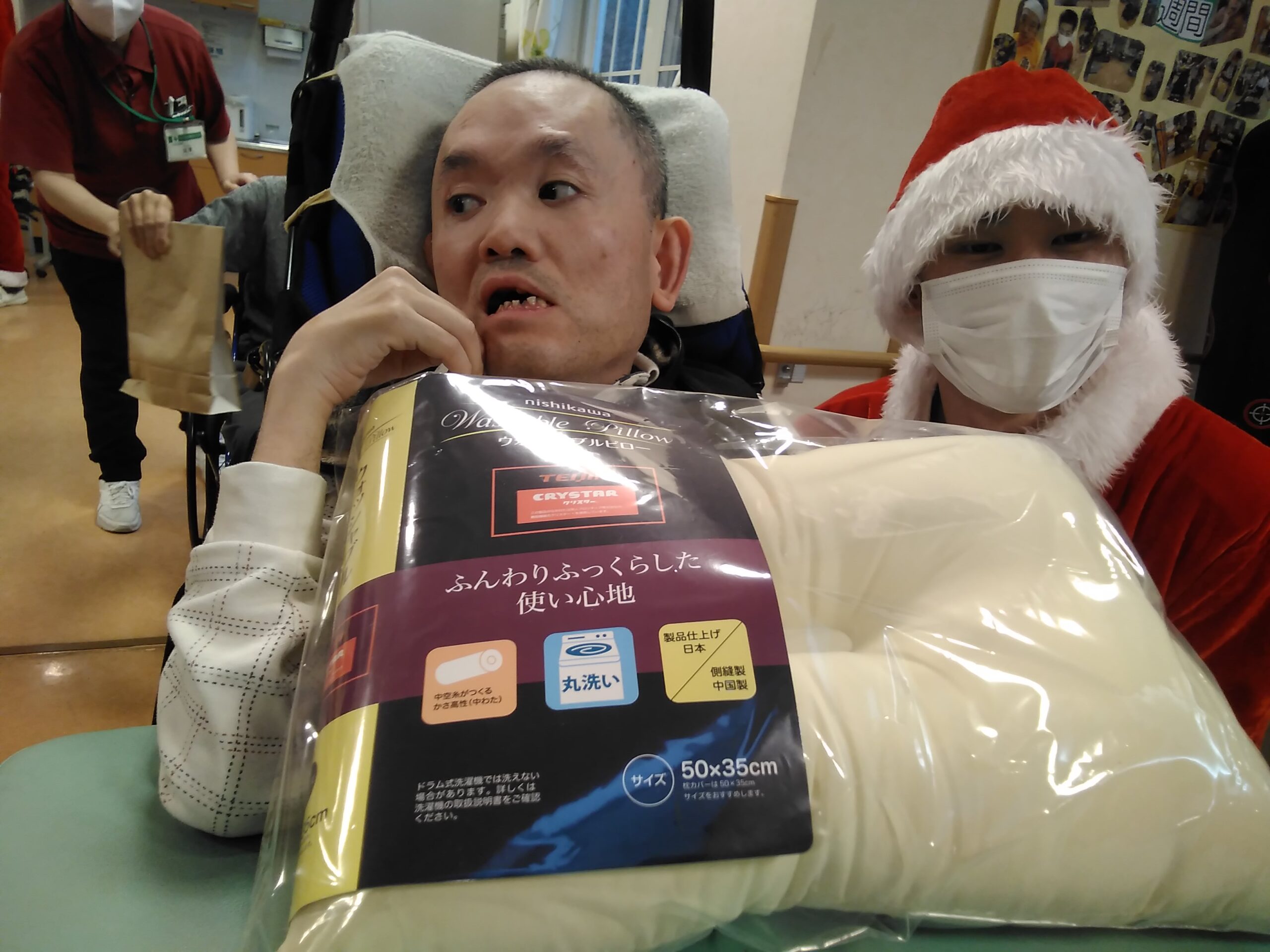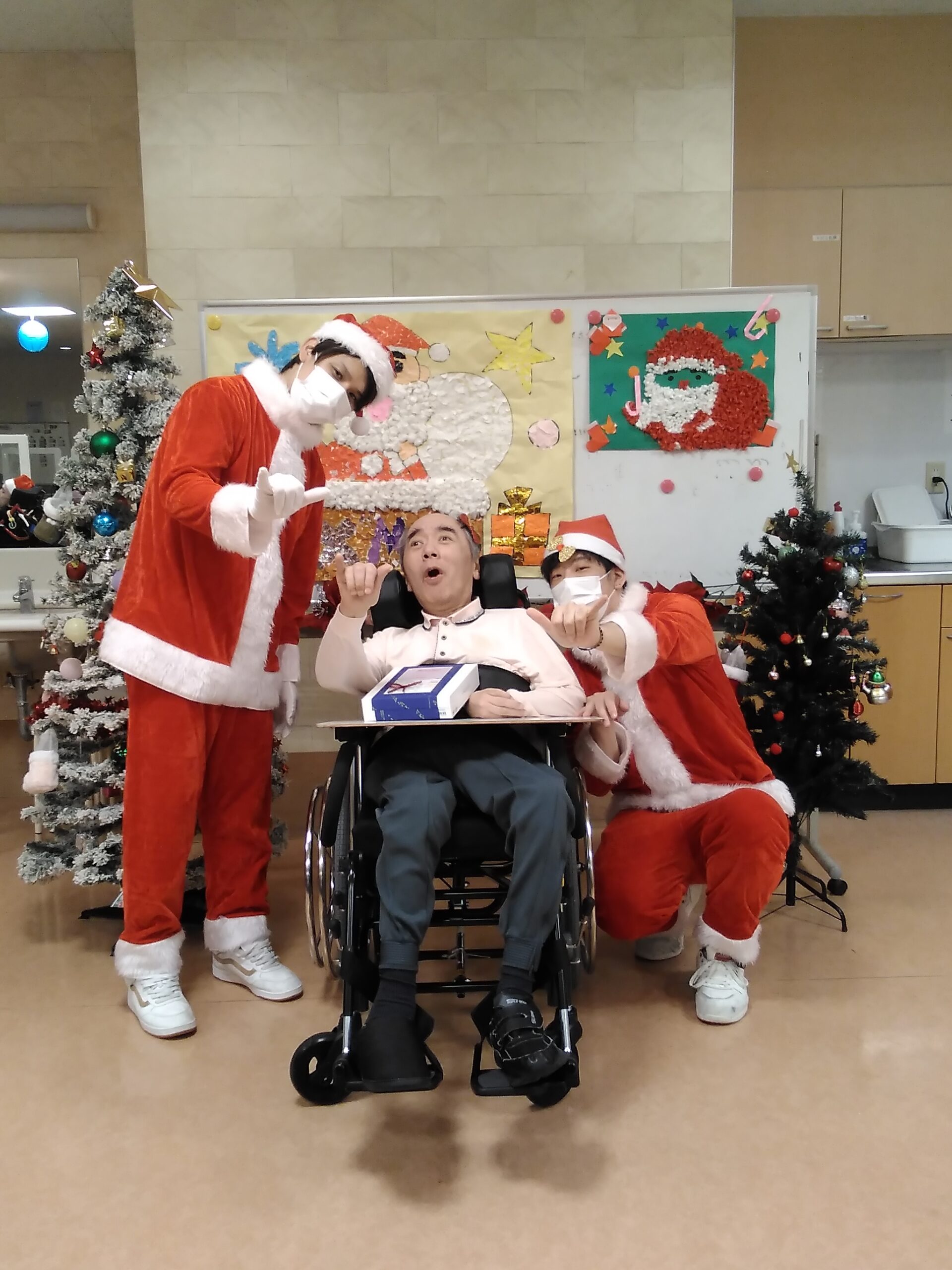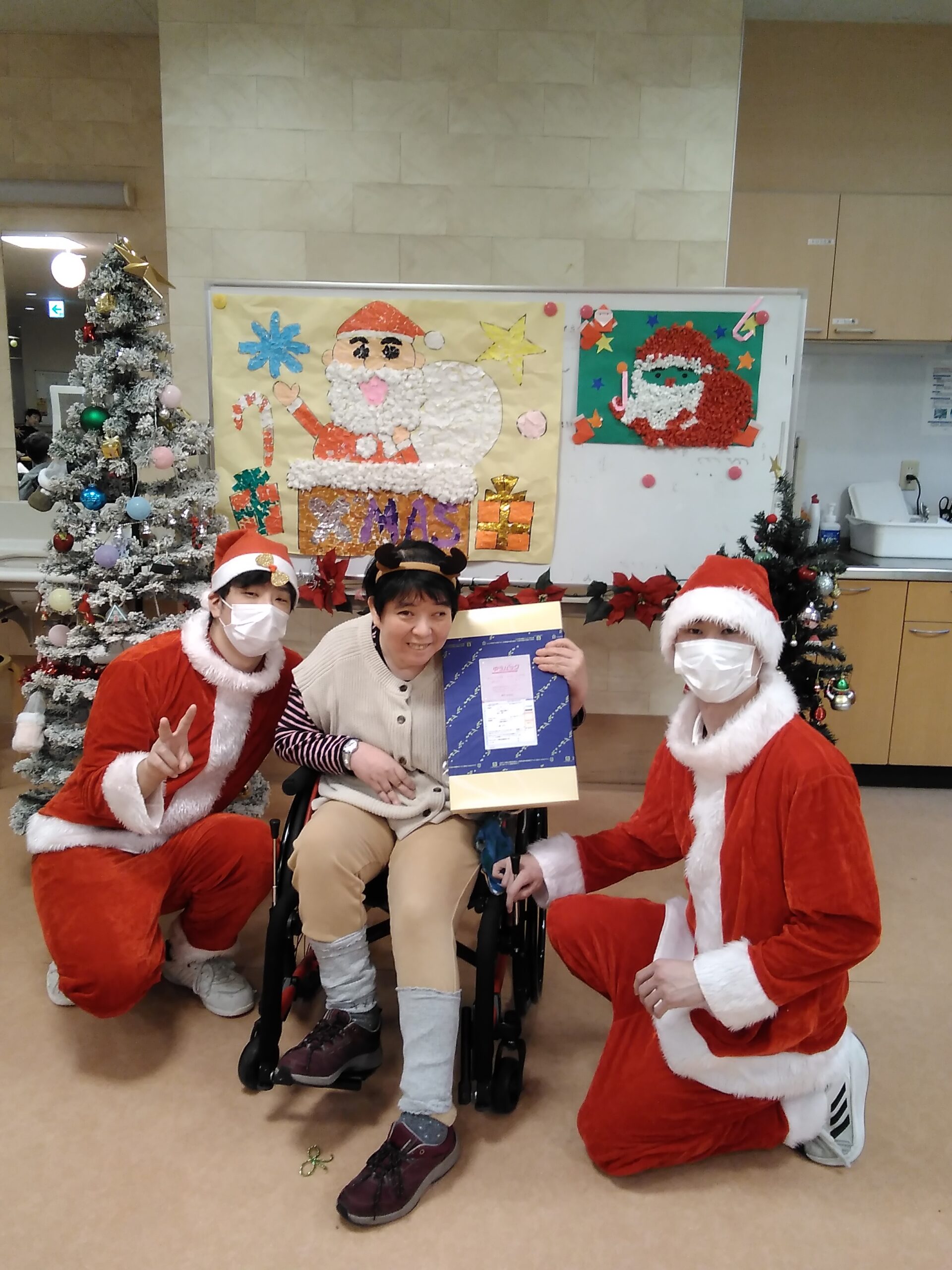 複数人のサンタさんから手渡しでプレゼントを受け取り、写真撮影を行いました。