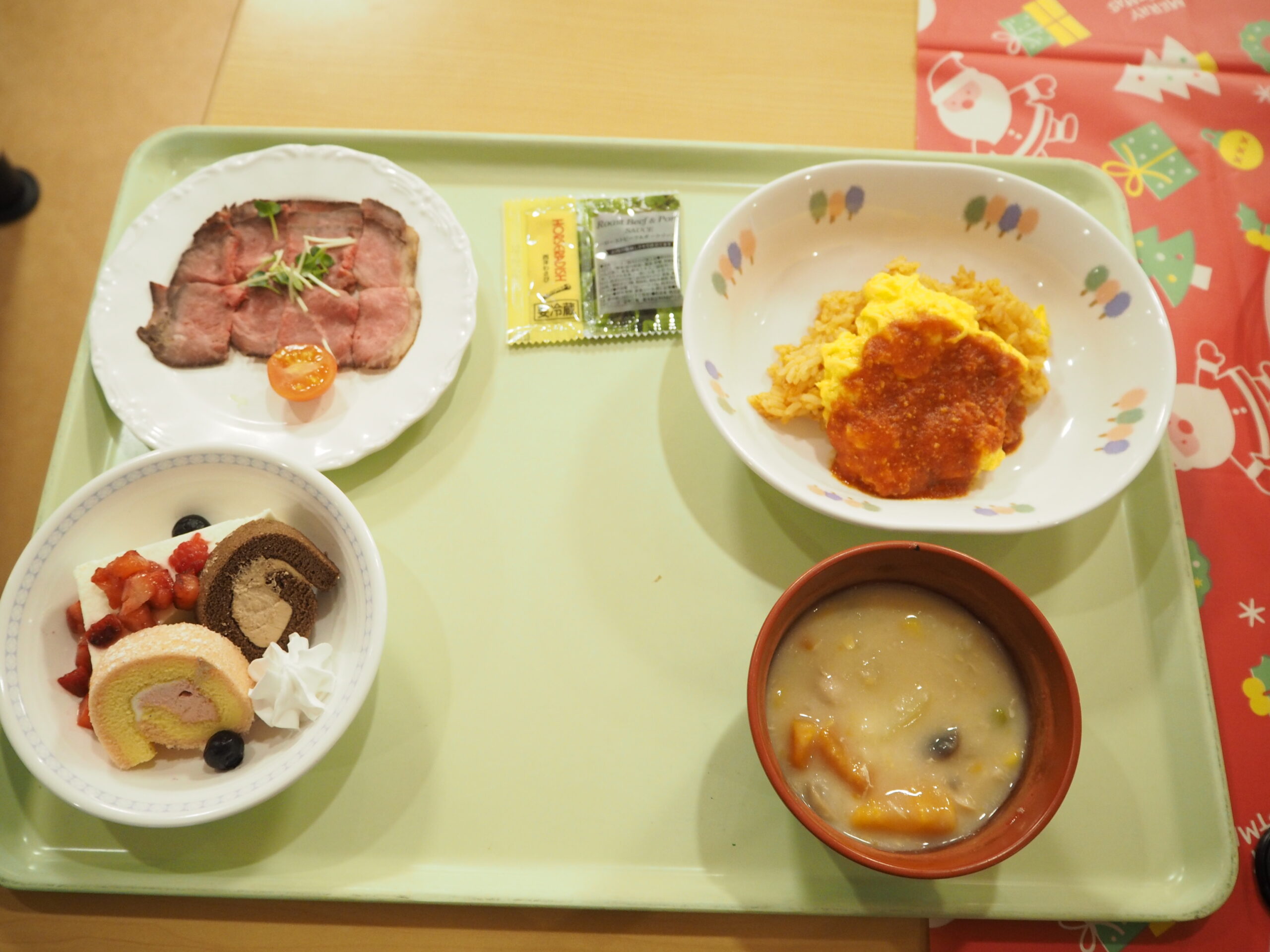 オムライスにコーンクリームシチュー、ローストビーフそしてデザートにケーキセットまで💖