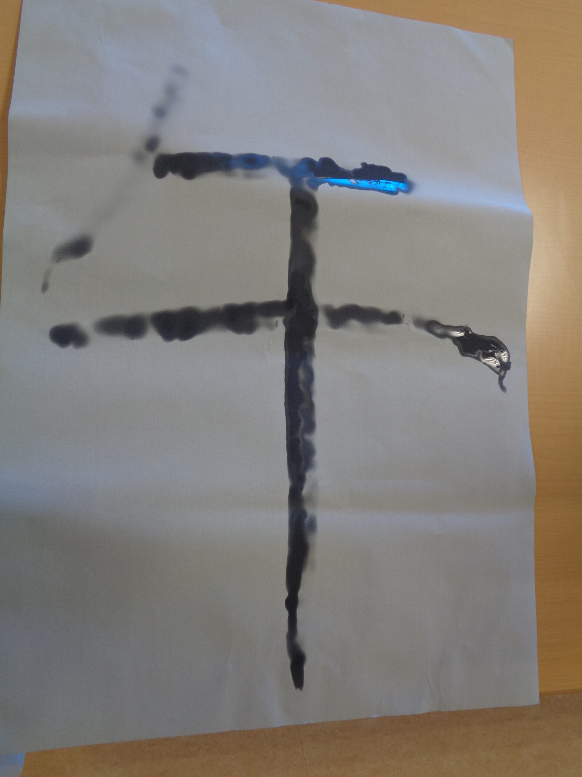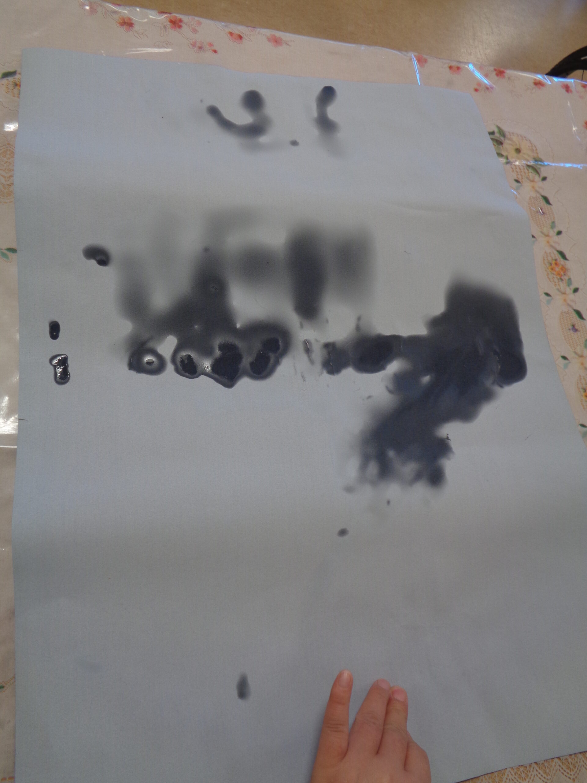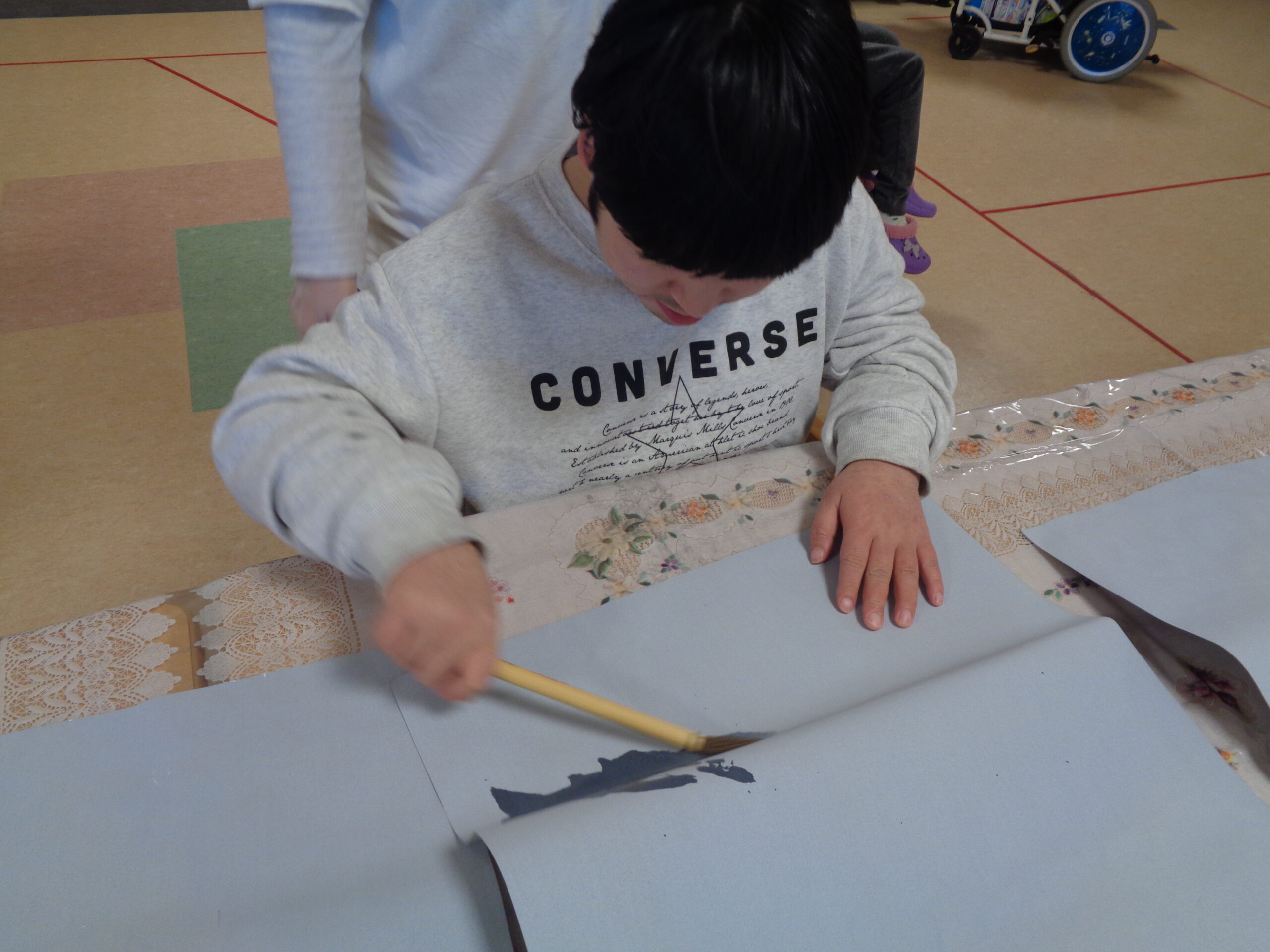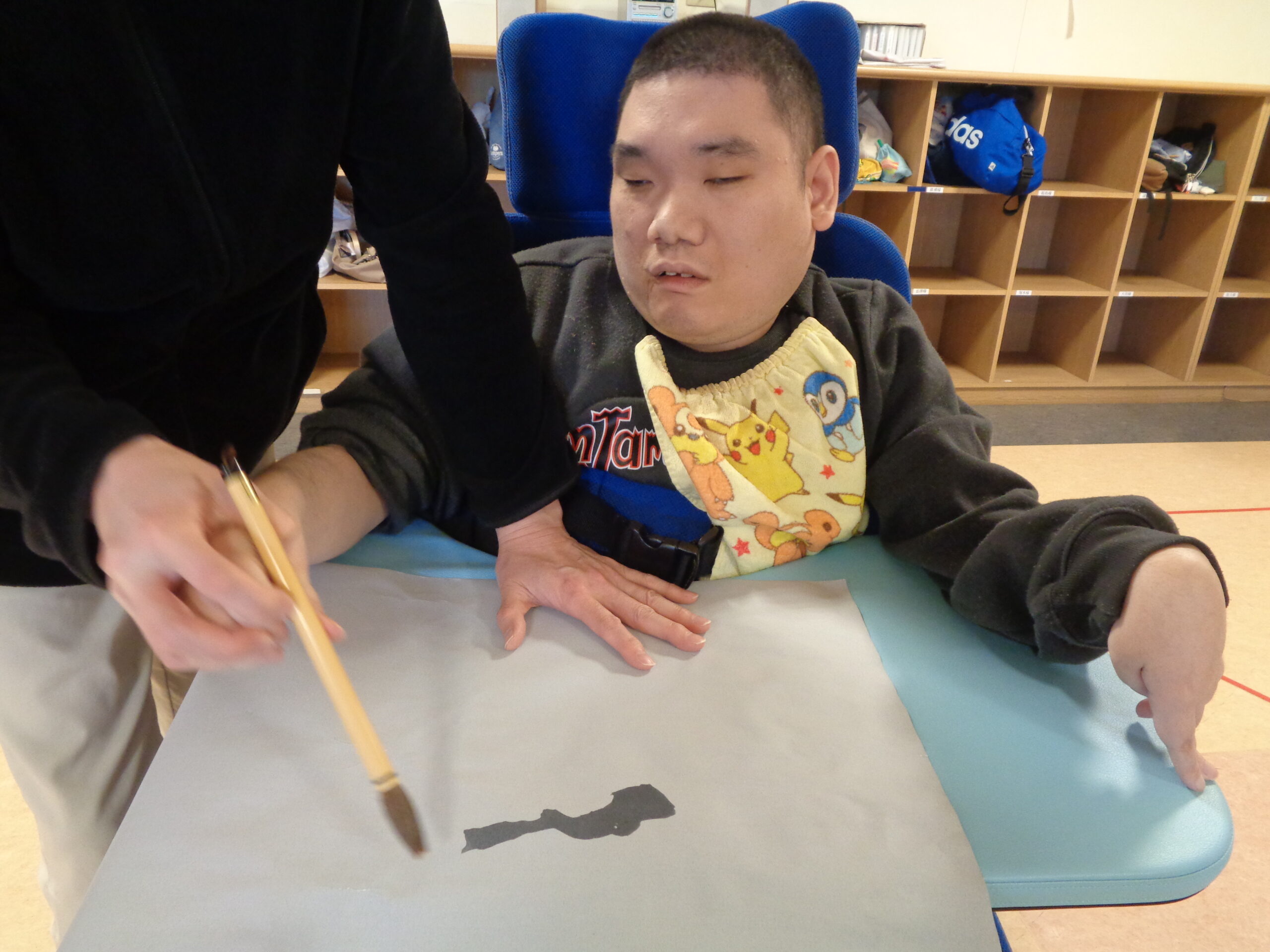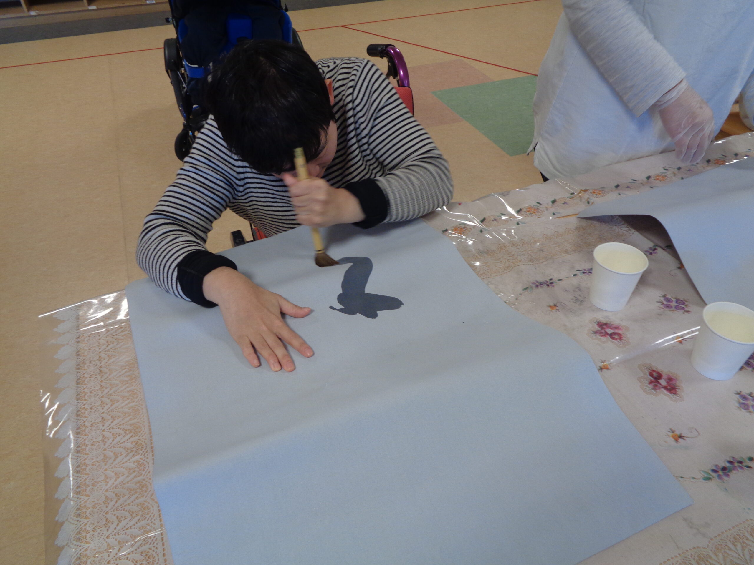 本物の墨は汚れてしまうので、水習字です。