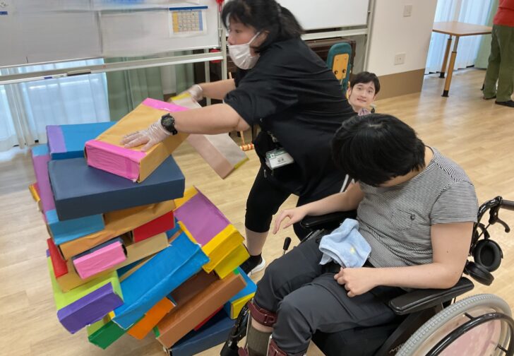 本日レクリエーションで牛乳パックタワーを行いました。 まずは牛乳パックで……