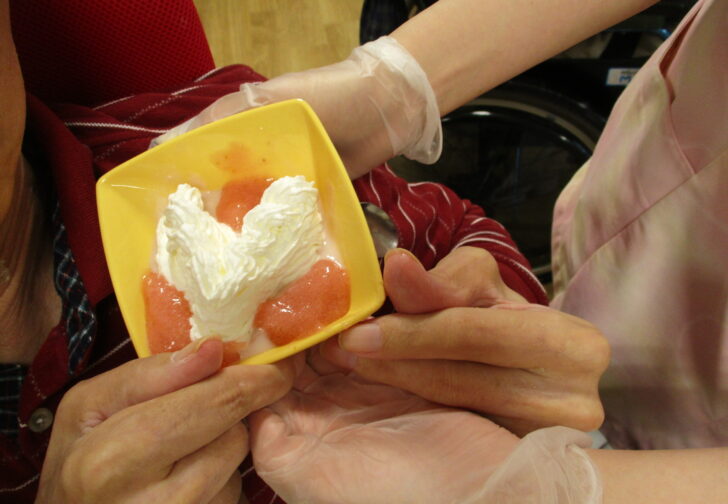 今月の食事レクリエーションはイチゴムースを作りました。 いちごが美味しい……