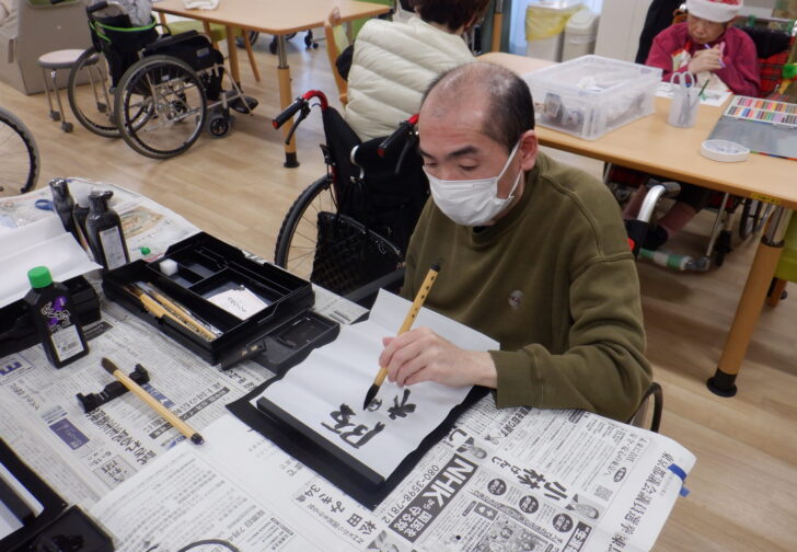 日中活動では「書初め」を行いました。 皆さん、それぞれ好きな言葉を文字に……