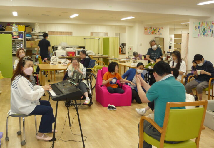 5月より月1回、音楽療法士を招いて、全員参加型の活動を行っています。 ……
