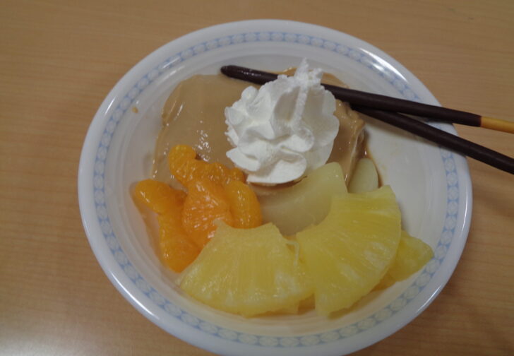 毎年恒例のクッキングを行ないました。 今年は、プリンアラモードを作りまし……