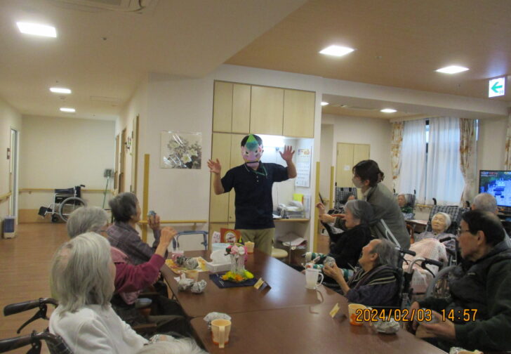 今月は節分ということで豆まきを行いました。 職員が鬼となり、みんなで鬼を……