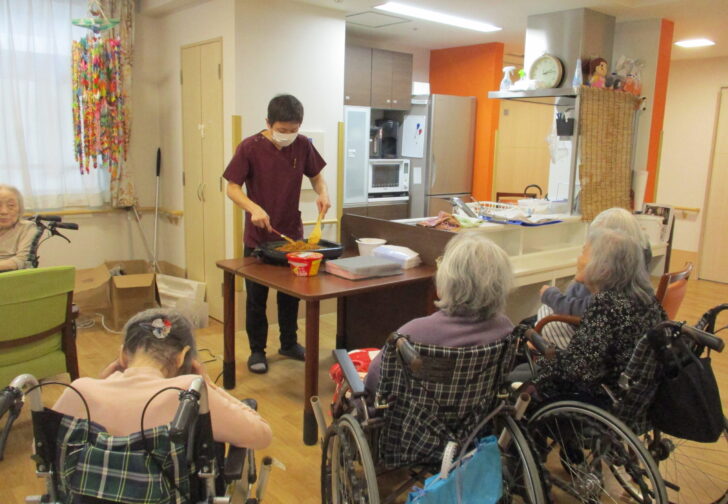 食事レクリエーションにてホットケーキを焼きました。 職員が焼いているとこ……